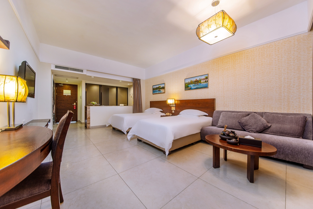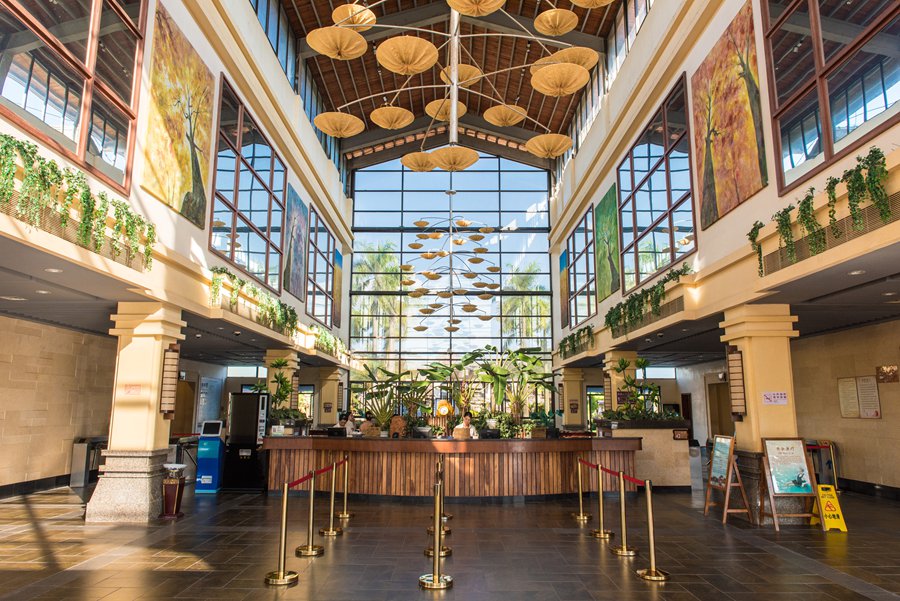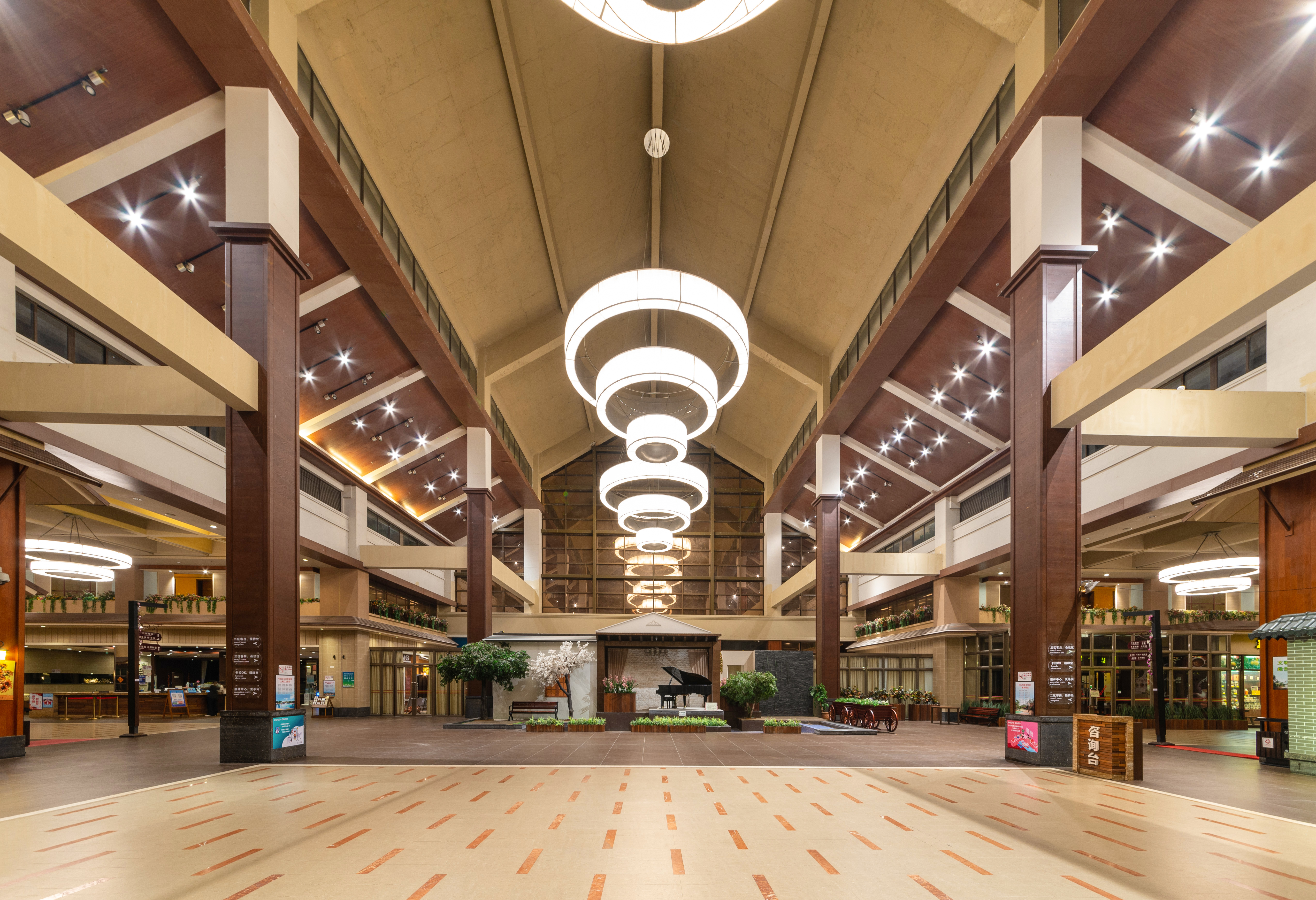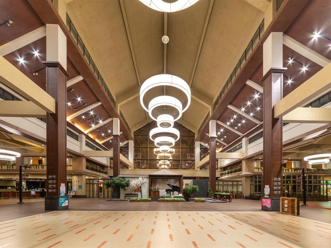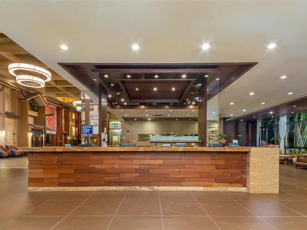 酒店大堂的布局格外精巧细致,淡黄伞状吊灯,显出古朴典雅的格调。