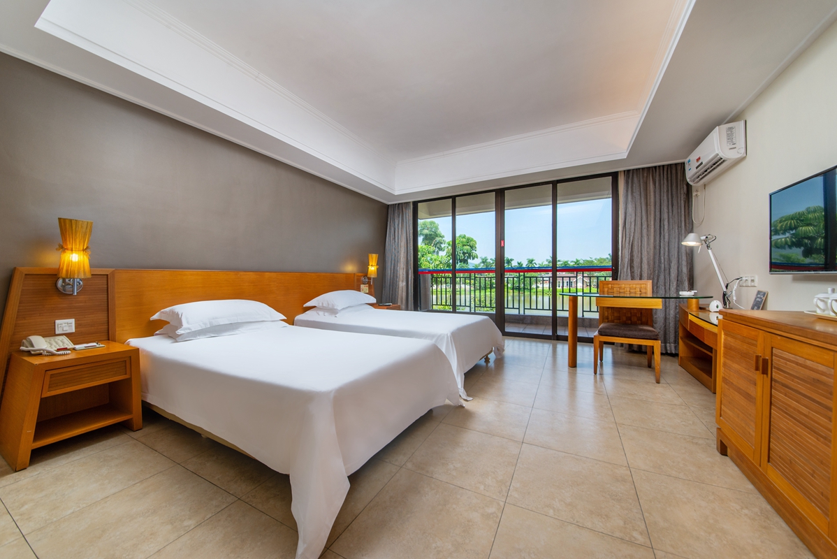 酒店一大特色,木质的结构,田园风的摆设,还有满目浓郁的绿色。走进门去,精致的客房布置,简约现代的装饰风格,将略显欧式的设计融入得恰到好处。