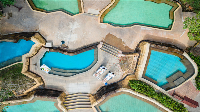 温泉区有108个温泉池,依山而建,独享纯粹的大自然气息,水质晶莹剔透无异味,既有浪漫风情的情侣池,又有适合温馨嬉戏家庭乐的温泉池。