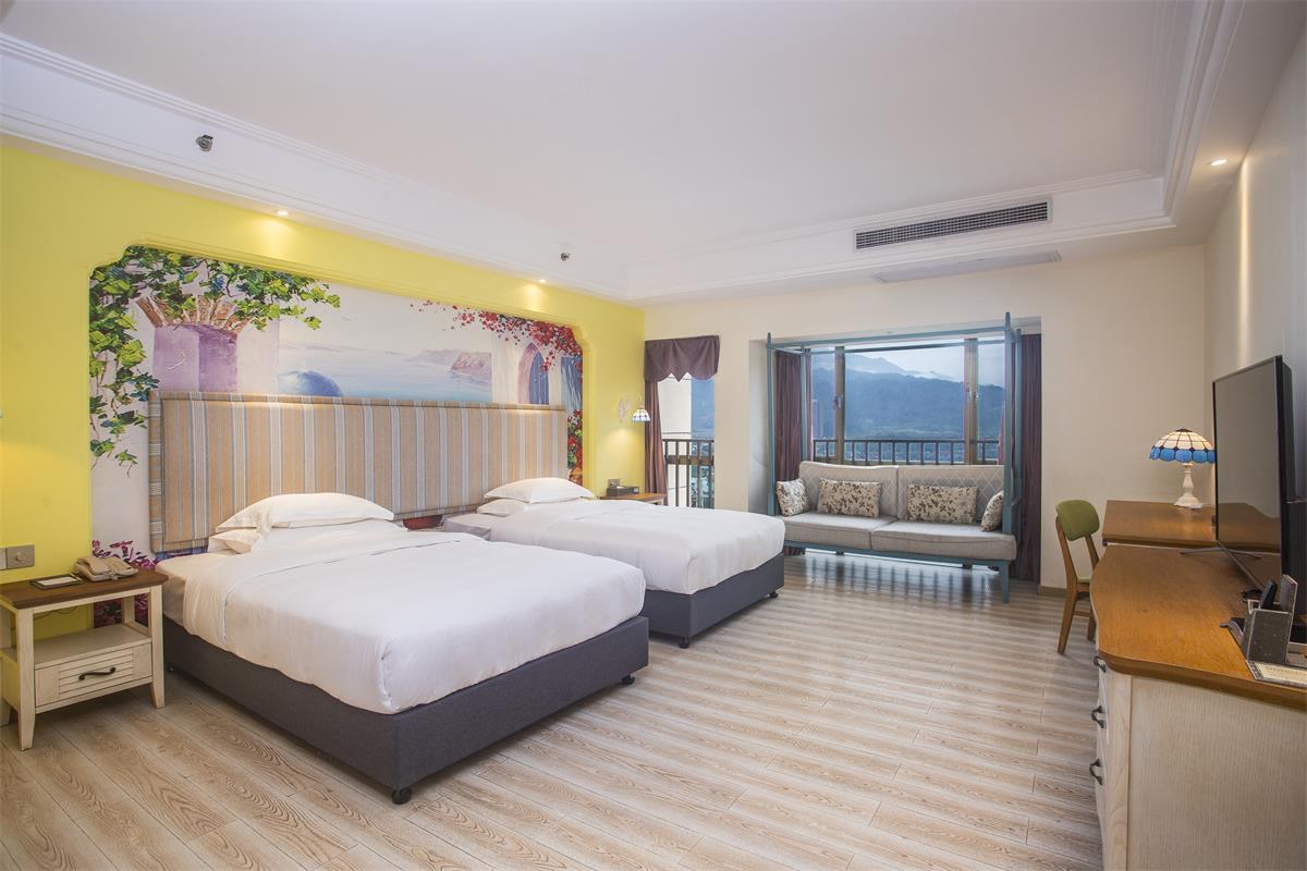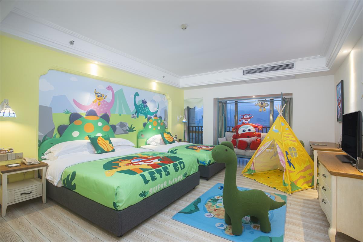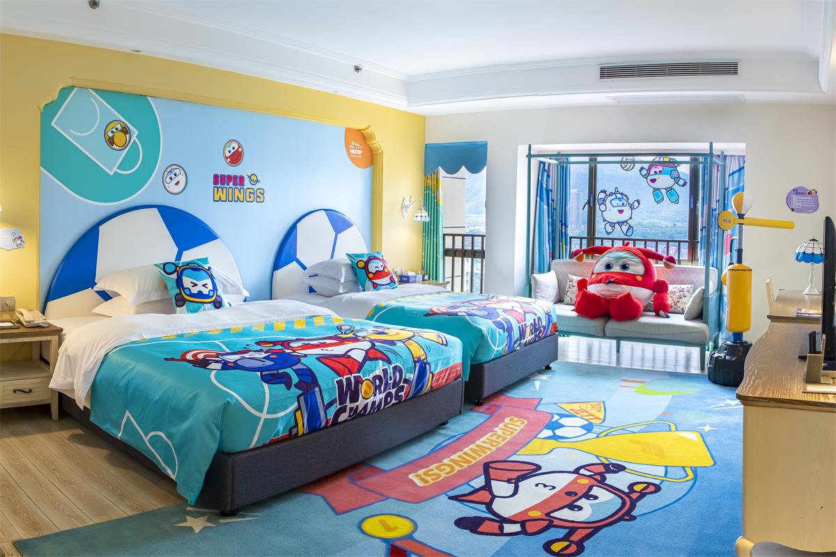 酒店客房总规模1200间,除了酷芽超级飞侠/猪猪侠亲子客房,还设有山景、园景、豪华套房等主题客房,每间客房室内空间线条色彩鲜明,以简洁的生活方式给每一位宾客营造时尚、舒适、温馨的体验。