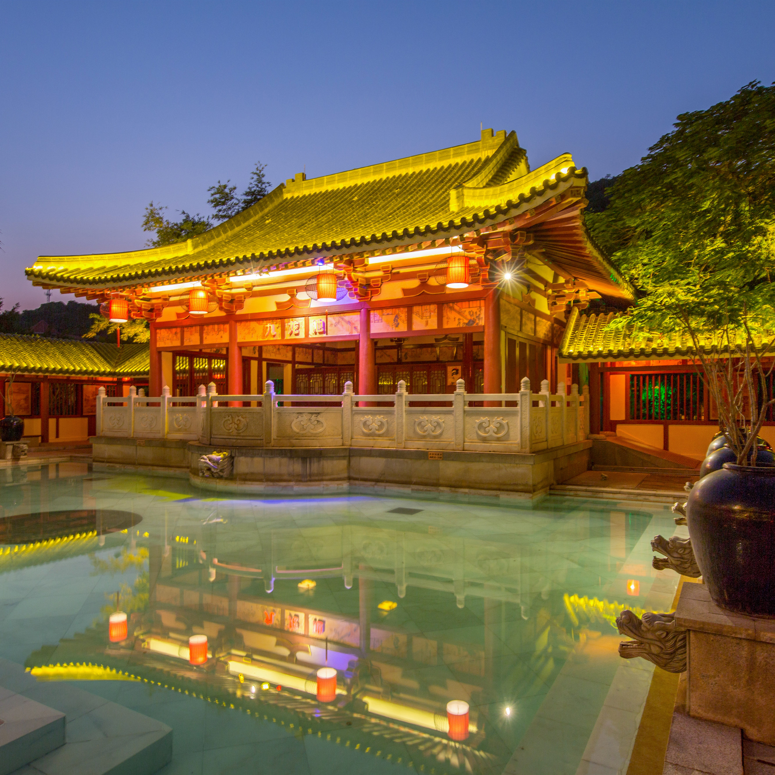 中国温泉区设众多、等特色温泉池,充分展示了沐浴文化。楼阁起伏,庑深廊回,唐时仙乐风飘,再现了华清宫当年的盛况。