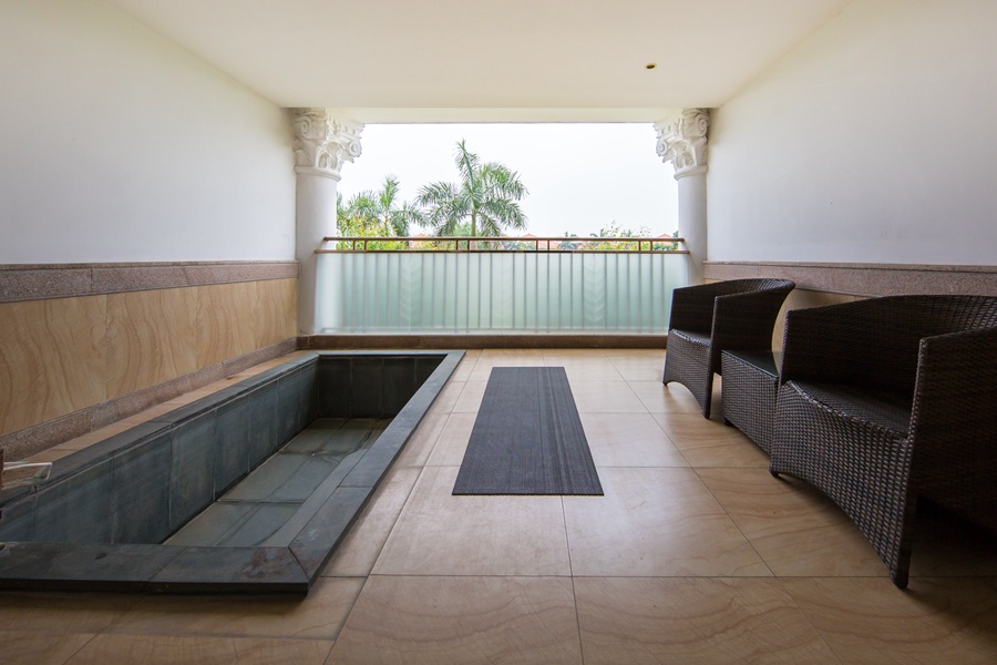 房内还带独立温泉池子,以园林为背景,满足私密泡汤的需求。