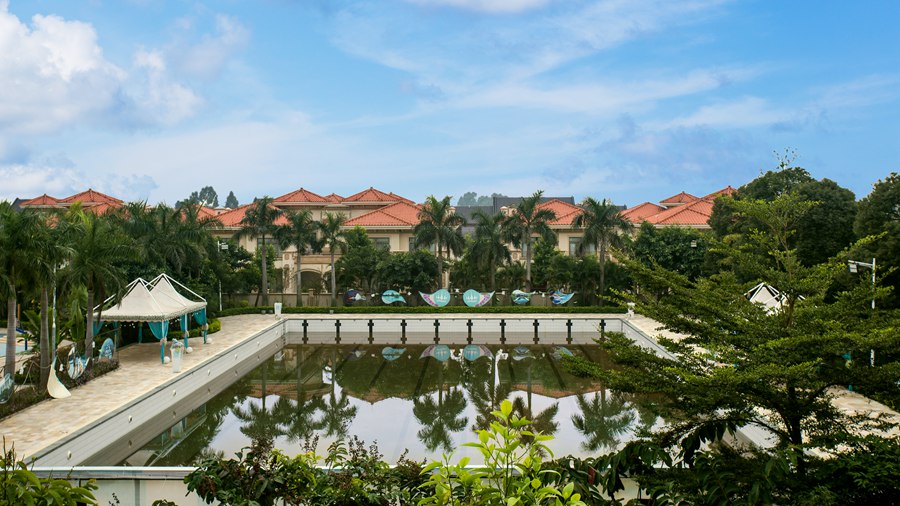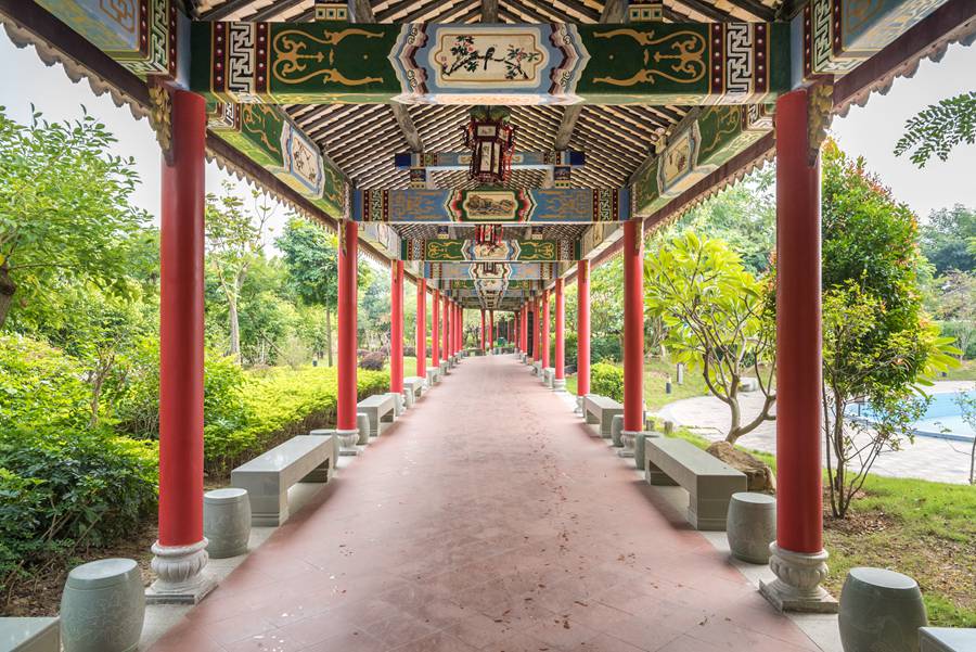 2、度假村呈园林式设计,古典景观长廊、雕梁画栋,汲取皇家园林园艺精粹,别具中式风情。