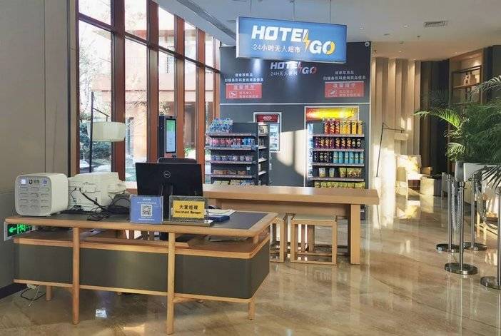 一入酒店大堂,就有智能小机器人迎宾,你可以和它互动。如果在酒店内想买一些饮料零食,可以到大堂的24小时无人超市,也可以上机器人商城选购,还有小机器人送上门哦!