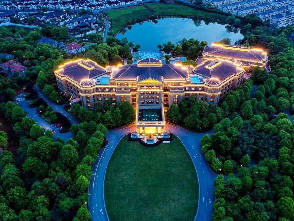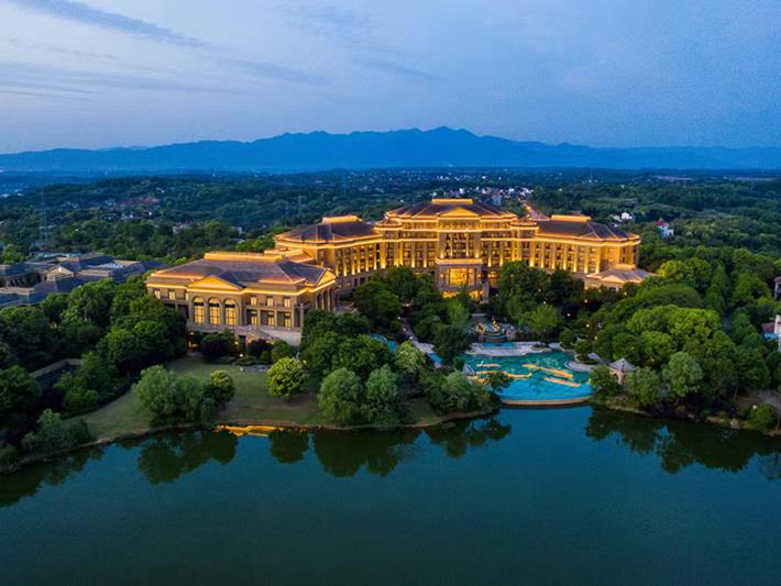酒店地处新昌塔山山顶,背靠连绵起伏的群山,面向一汪清澈见底的湖水,俯瞰新昌城市全貌。具有浓郁地中海风格的大酒店,以其绒黄的魅力色彩矗立在绿色的植物海洋中,令人叹为观止。