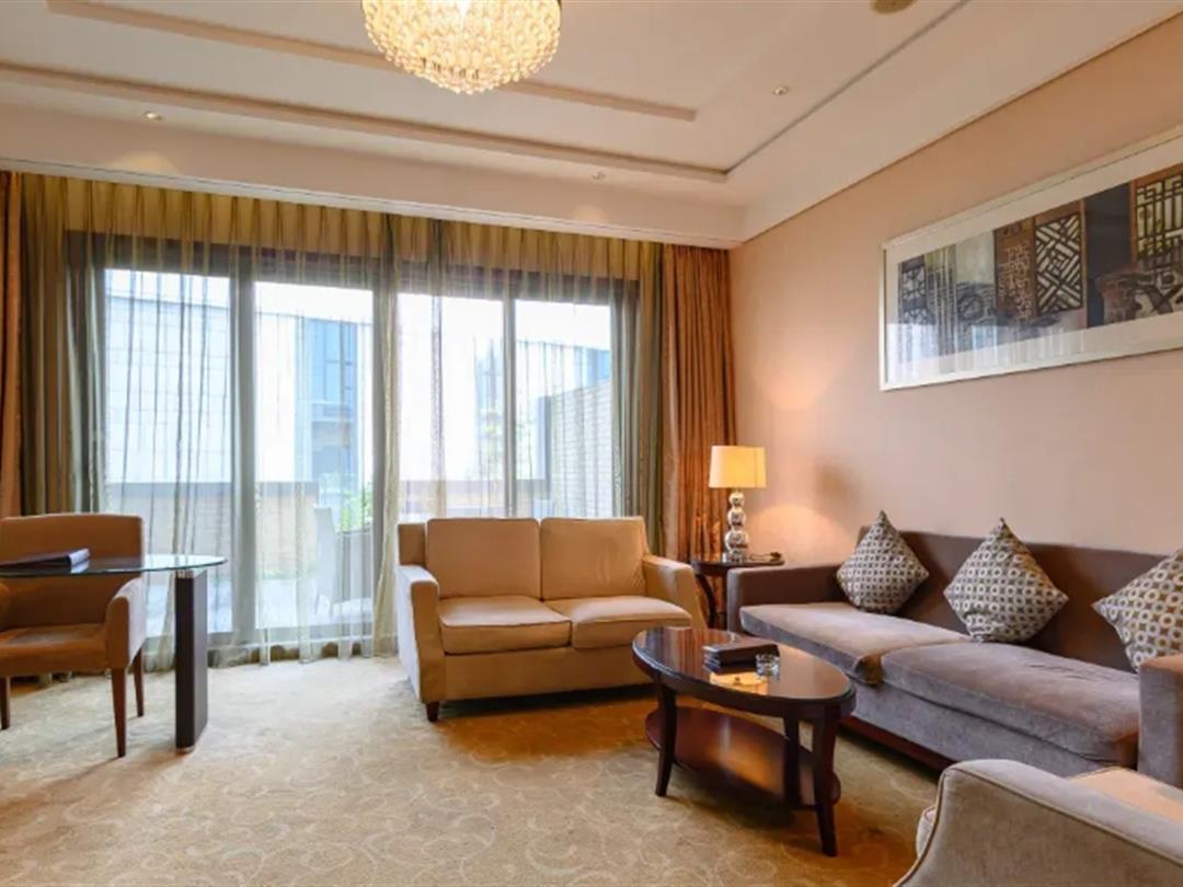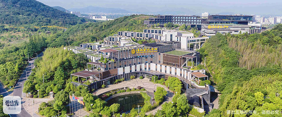 该酒店地处科技城稼先路,近龙山路、太湖湿地公园、白马涧、树山温泉;对面有个彩石湖公园,适合散步。中心占地面积达4万多平方米,三面环山,有着极其开阔的视野和丰富的景色。七栋单体建筑分而不断,与景观连为一体,宁静而高贵。
