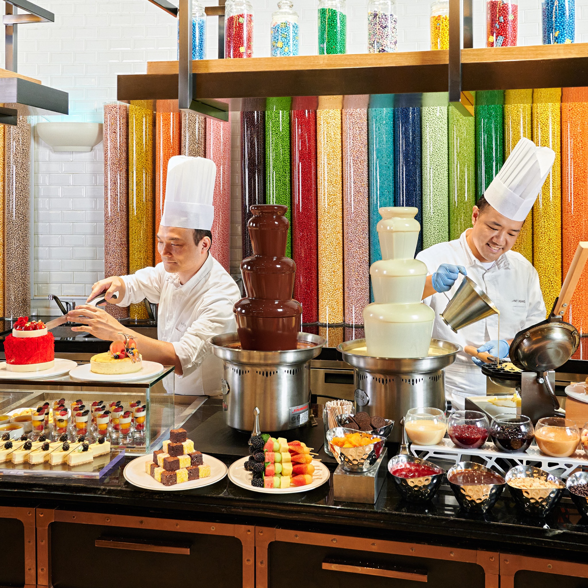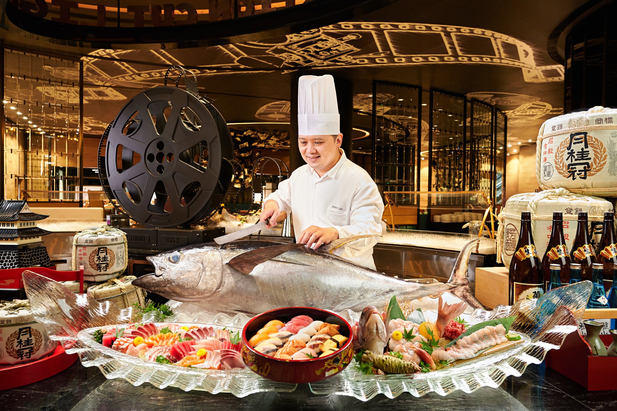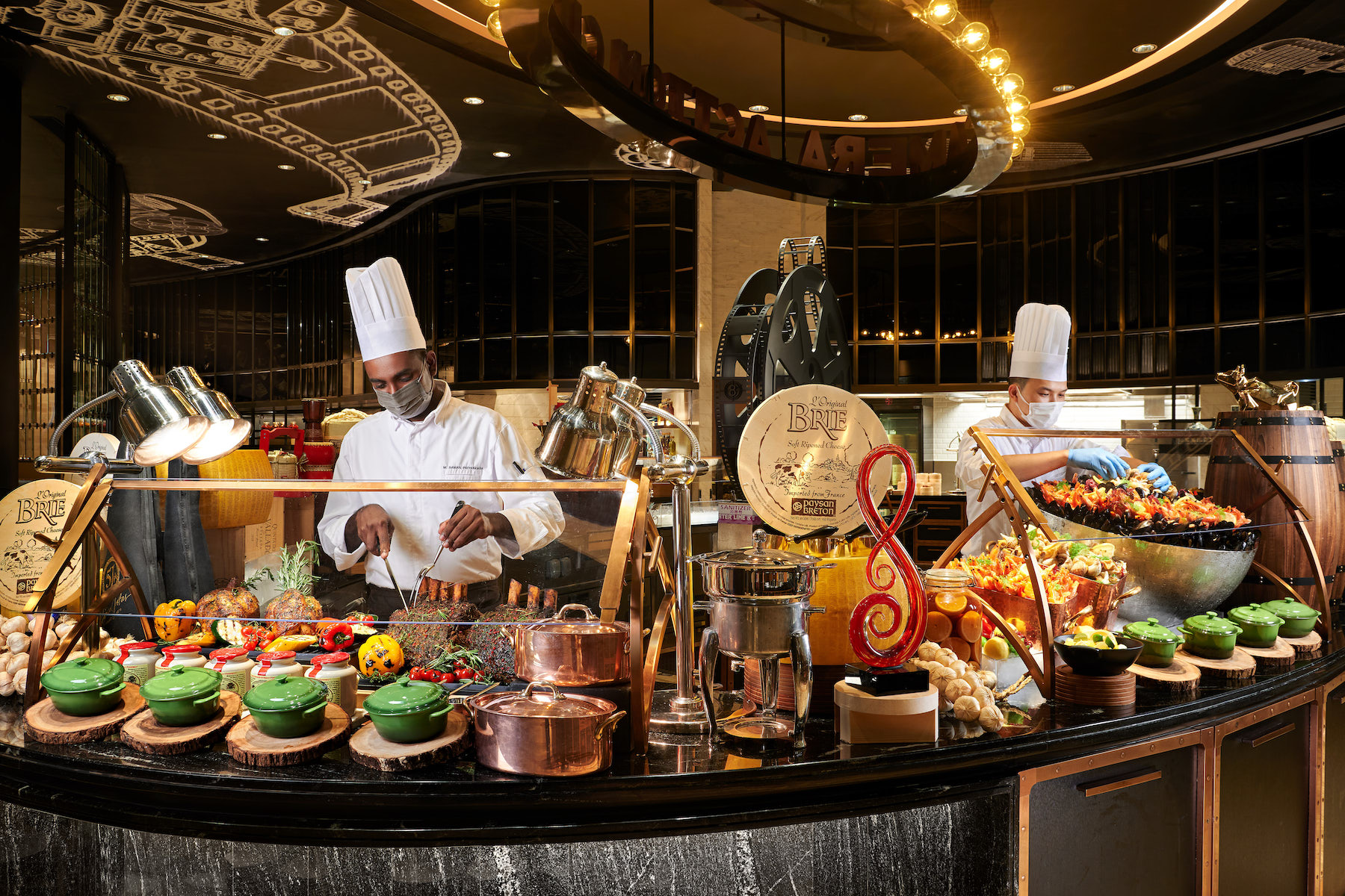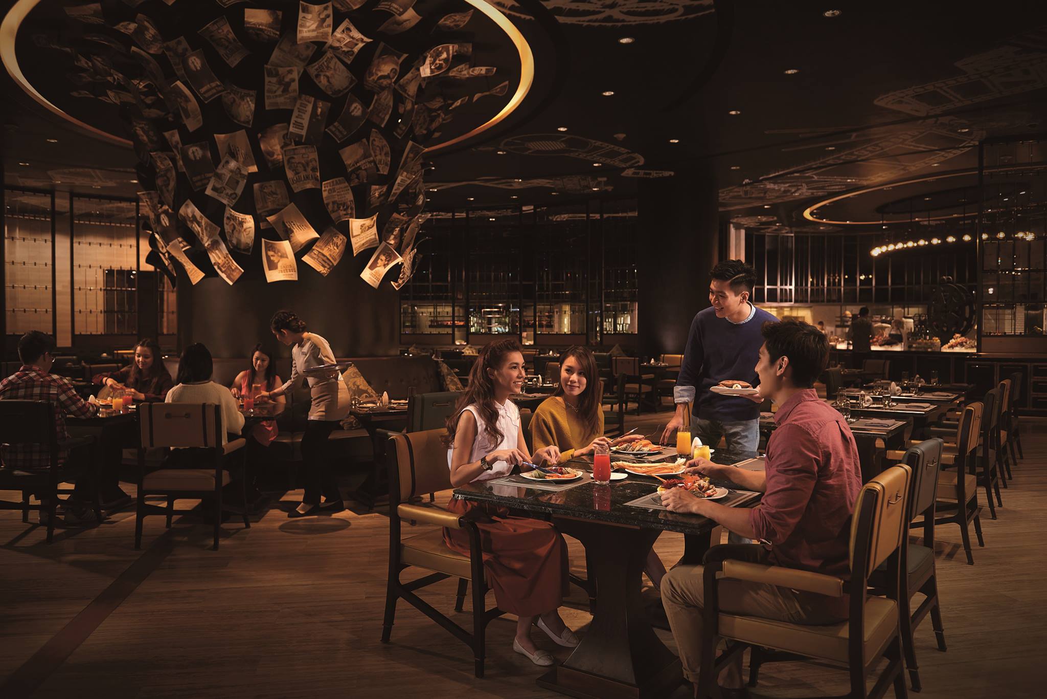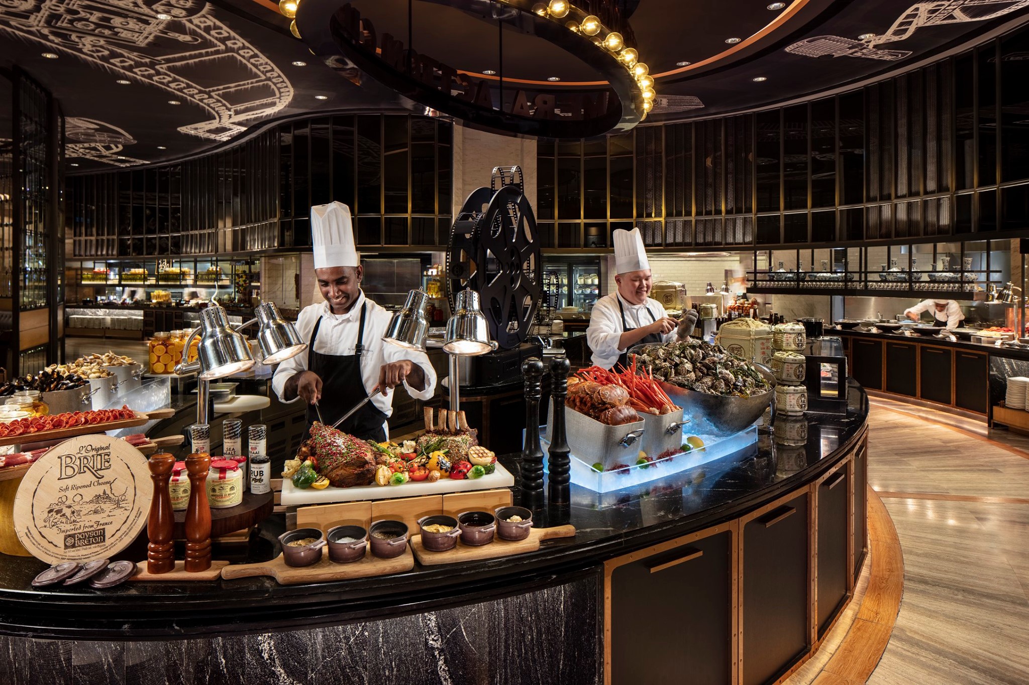 自助晚餐全场瞩目:席切原条黄鳍吞拿鱼!师傅尽显刀工,即切刺身,视觉味蕾双重满足,赏心悦目;巴西式烧烤炉源源烤制安格斯西冷牛扒、新西兰羊架、澳洲猪肋骨、大虾等等,惹味香辛扑鼻;大厨在开放式厨房为您即席炮制波士顿龙虾、深海龙趸、大连鲜鲍鱼,剁椒蒜香四溢;少不了时令生蚝、雪蟹脚、切肉、镬气小炒、印度烤肉咖哩、中式烧味、铁板烧、刺身寿司等等,更有全新登场的儿童美食区、琳琅甜点及朱古力喷泉,丰盛多元选择,全方位照顾每一位客人的美食追求。