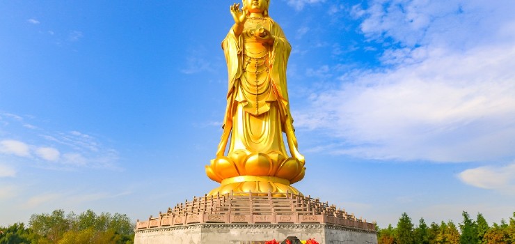 闲来石上观流水,欲洗禅衣未有尘。似乎这座水月观音更能阐释水与佛的交融之处,水鉴佛影,佛观水象,高达25米的水月观音佛像伫立在大纵湖畔,早已成为里下河地区广为流传的祈福胜地,让人于水中明心见性,于妙音中得见大悟。