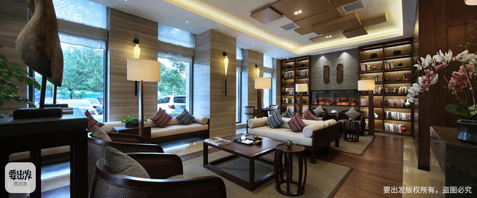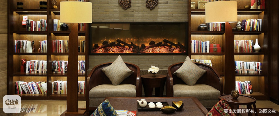 酒店大堂扑面而来的君亭定制香氛,搭配各种绿植、流水、池塘等元素,让人觉得沉静安逸。书吧区书墙中间还有效仿火炉的围炉,可边看书边享用咖啡或茶饮。