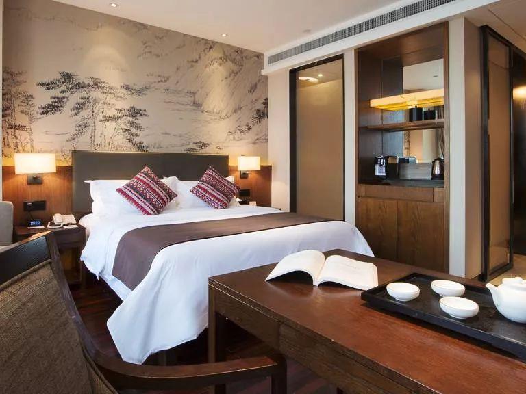 酒店客房位于16-25楼,168间风格迥异的房间,面积26~134㎡不等。写意水墨背景墙古朴悠然,液晶电视、木质地板、房间茶包都是TWININGS的,定制金可儿床垫、胶囊咖啡机等设施一应俱全。