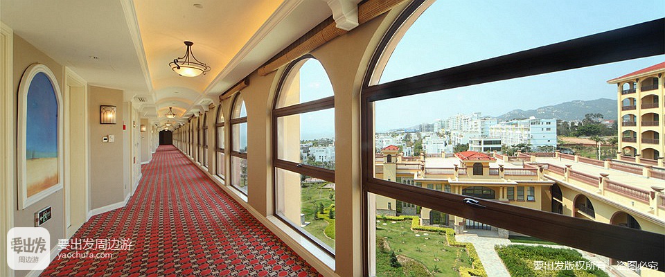 1、酒店依山傍海,整体建筑呈自然坡形状,浓郁的西班牙建筑风格。楼层采用单廊设计,可海景、山景、园景三景同享。