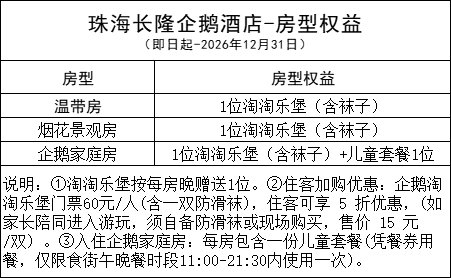 适用酒店及套票包括横琴湾酒店、飞船酒店、企鹅酒店、马戏酒店住房套票(含飞船乐园门票套餐)。