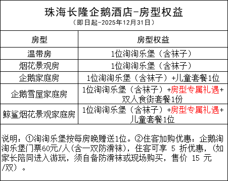 适用酒店及套票包括横琴湾酒店、飞船酒店、企鹅酒店、马戏酒店住房套票(含飞船乐园门票套餐)。