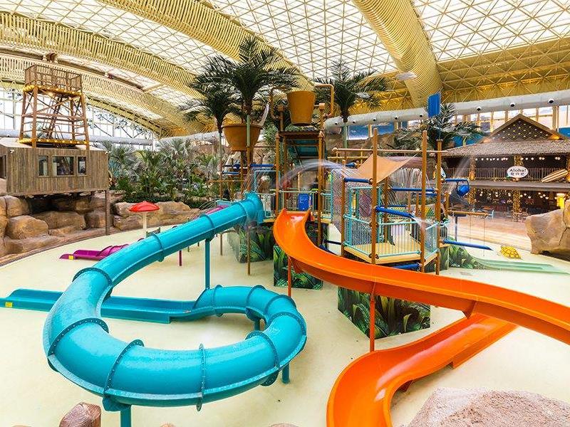 室内水乐园,波利尼西亚海岛风情十足,透明穹顶的设计,让你在欢乐戏水时可欣赏晴空万里,透过玻璃墙面亦可一览园外苍翠;嵌于热带自然植被中的乐园主体,穿梭于椰林水泊间,让您俨然亲临一座自然的阳光海岛。