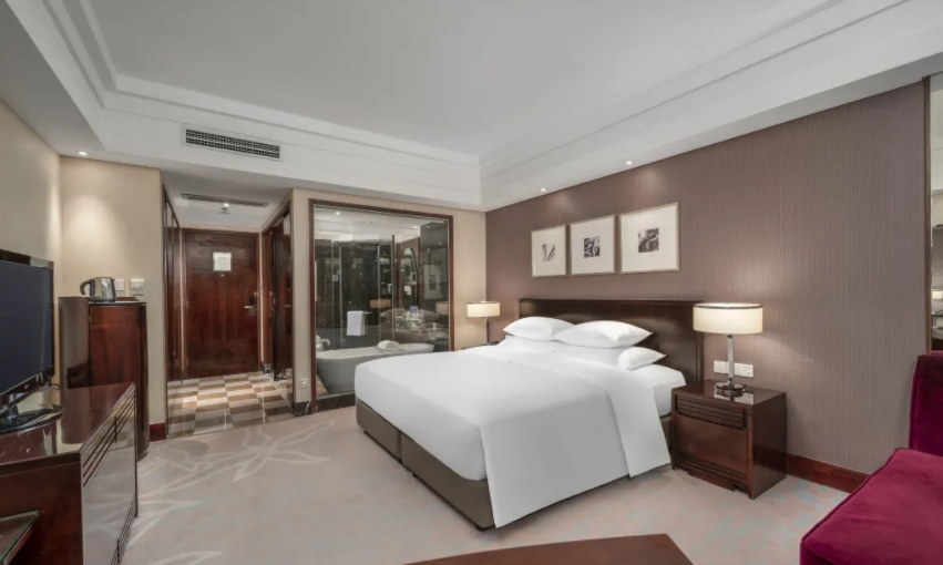 酒店的客房均采用落地玻璃,视角开阔;房内装修简而不约,家具时尚典雅,写字台、办公椅,可满足商旅宾客的不同入住需求。