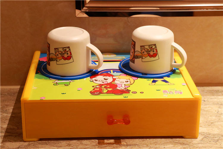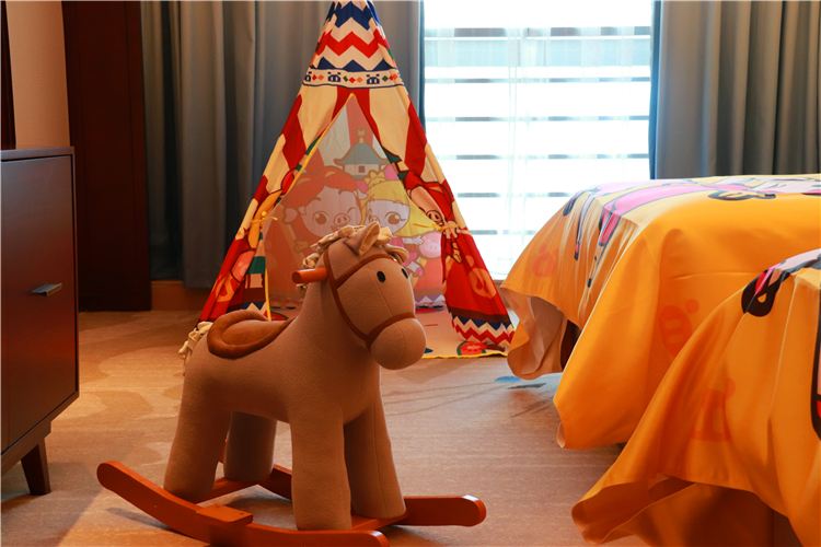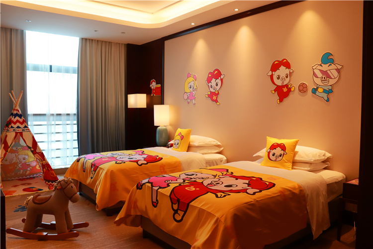 精心布置的装饰、无处不在的卡通图案,还有小朋友专属的桌椅和活动空间,亲子房的每个角落都充满着童趣和温馨。