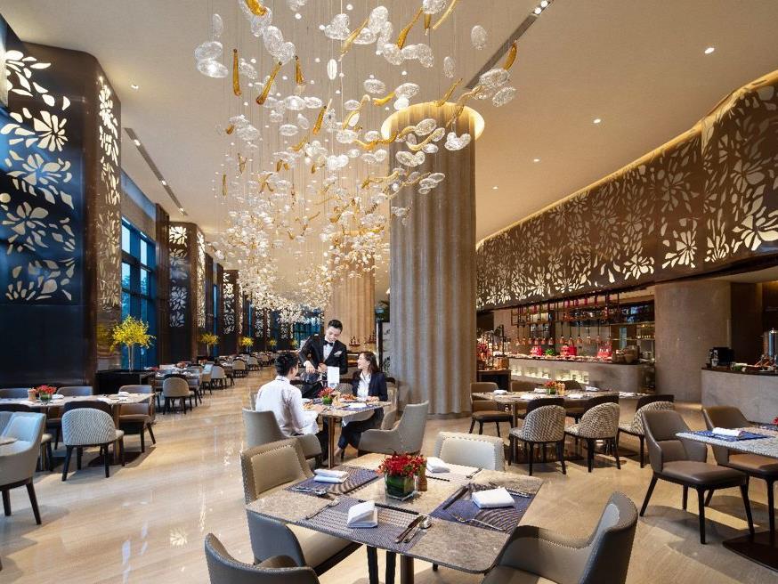 踏入星璨全日制餐厅,你将立刻有一种被全球各式美食包围的满足感。5.8米挑高星璨全日制餐厅,以全视野采光玻璃幕墙及“金沙”造境。十几个档口,200多道菜品的霸道自助餐。当