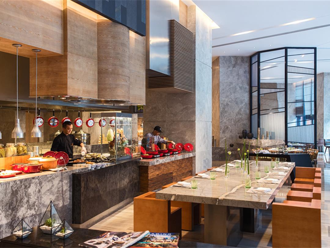 现代时尚的摩登餐厅-燃餐厅,由火山岩和椰子树等本地原材料打造而成的特色墙面,设计感十足。餐厅以不同主题焕新呈现多样自助晚餐,以多样的烹调方式来诠释中西方的地道美味,旨在赋予食客一场视觉味觉双重享受的自助盛筵。