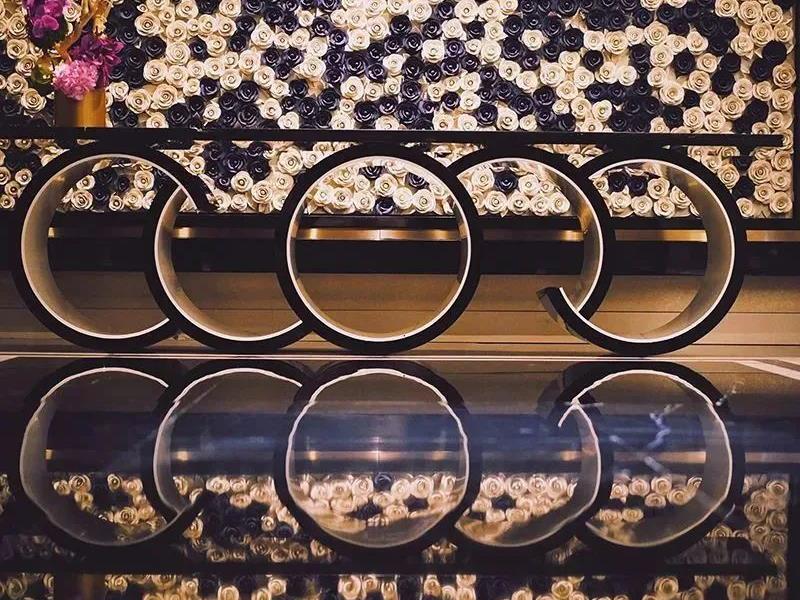 大堂酒廊入口处的1500朵宝石蓝与白色玫瑰,由加拿大设计师纯手工烧制、耗时4个月之久制成。