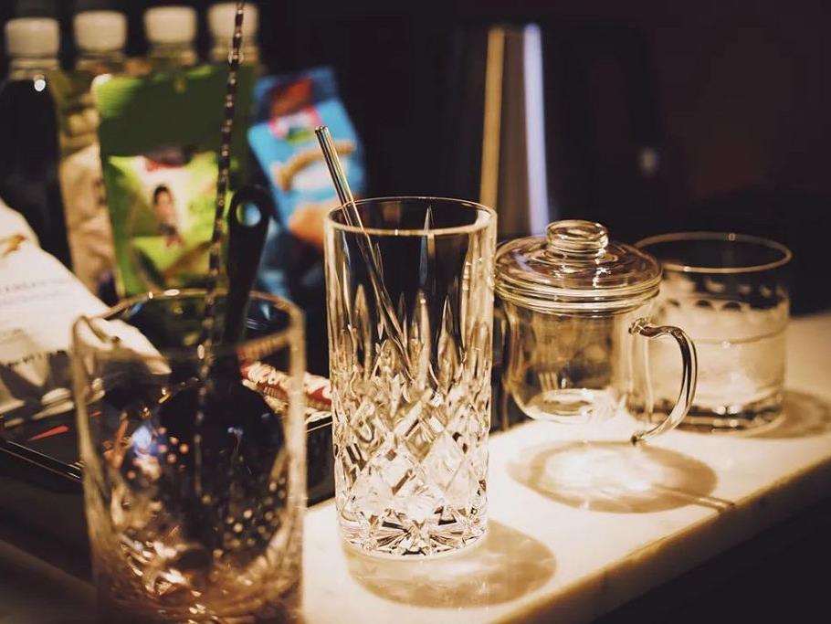 智能配套,符合当代人的居停需求。酷似行李箱的迷你酒吧柜,更是大放异彩,摆放着Nespresso咖啡机、TG茶包及全套可调cocktail的器皿和酒水等。