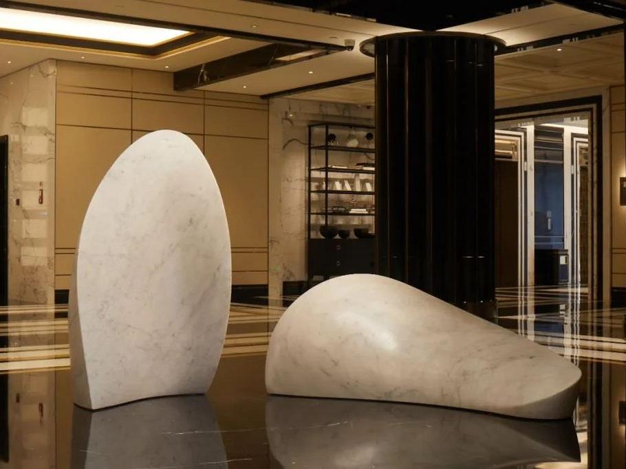 前台不远处的白色大理石雕像,名为“二重唱”,象征着微笑迎宾的男女主人,取“锦瑟合鸣“之意,其出自香港极简主义雕塑家Cynthia Sah之手。