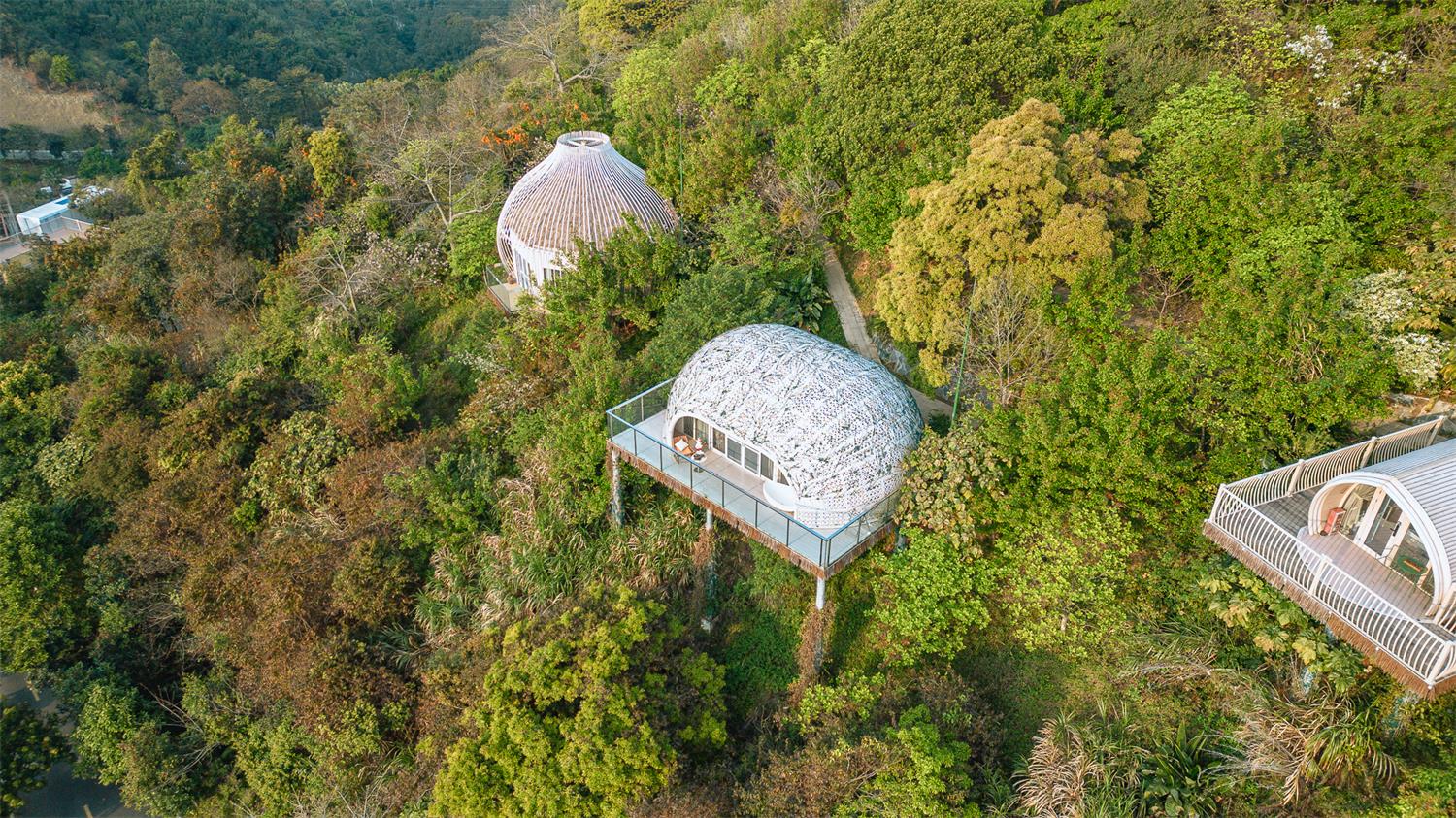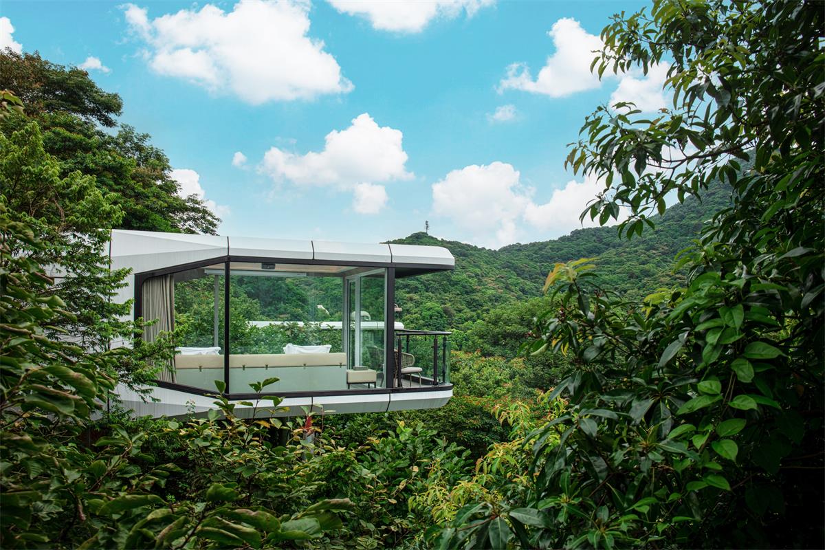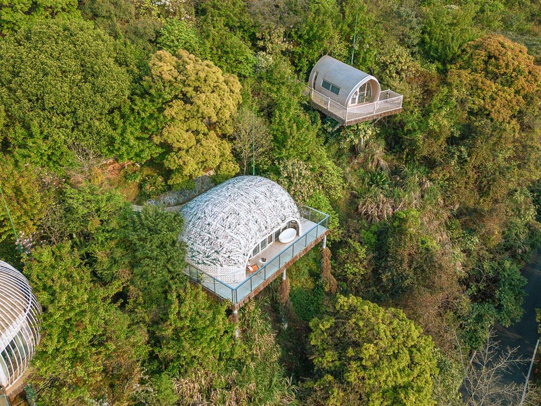 藏身于山谷之间的太空舱,周围树木枝叶繁盛,层叶荡漾,偶见远山。依山而建的太空舱,270°观景视野让你暂离喧嚣城市,感受山居生活之美。