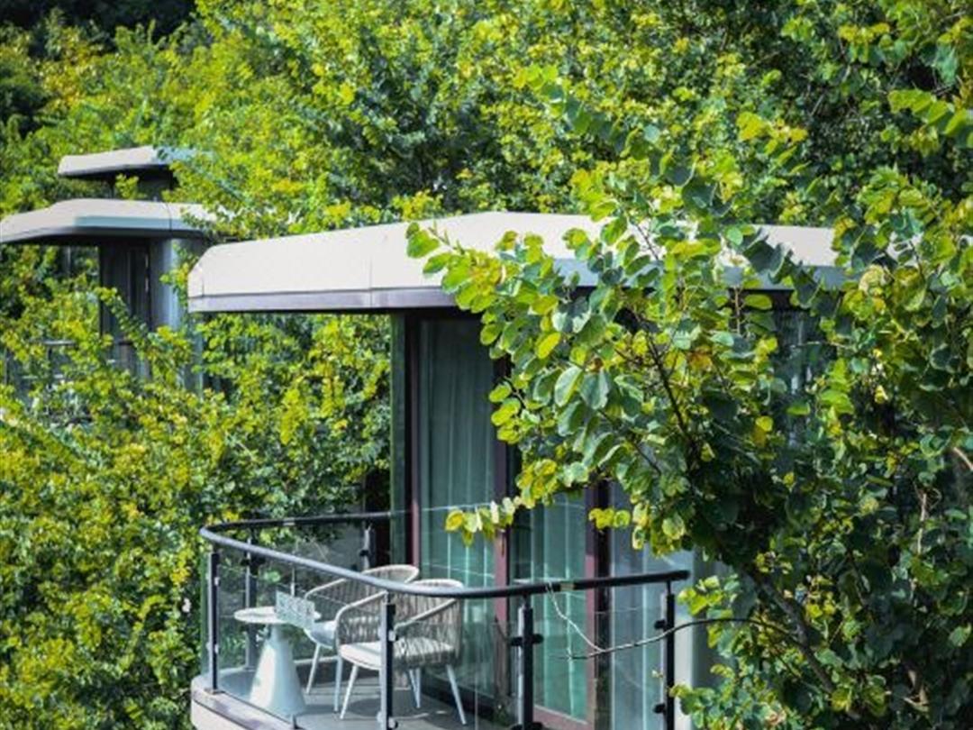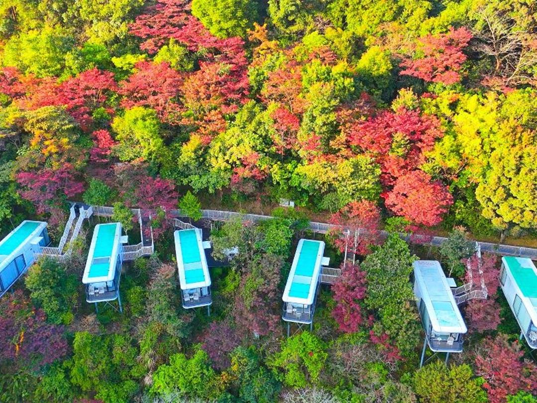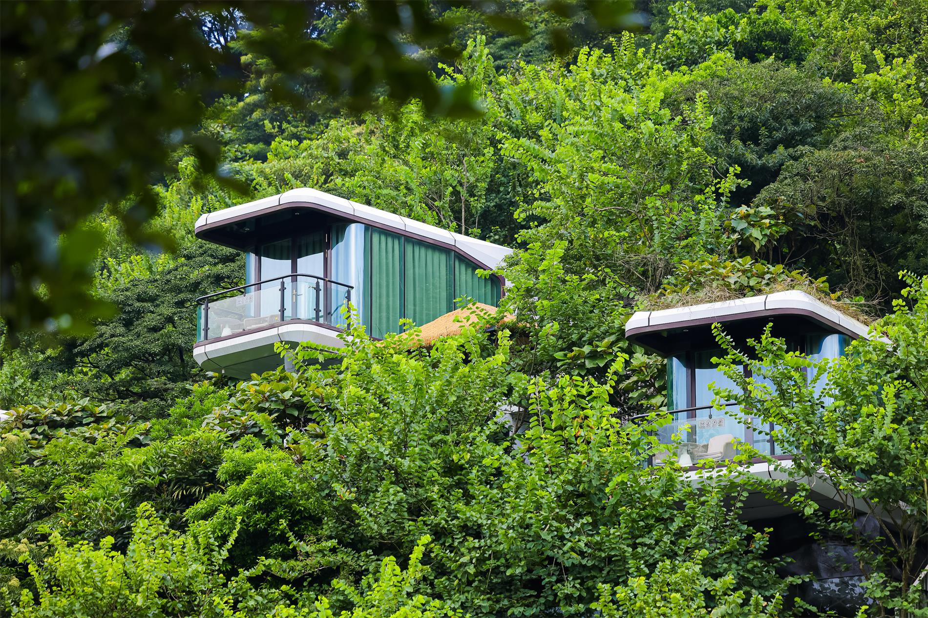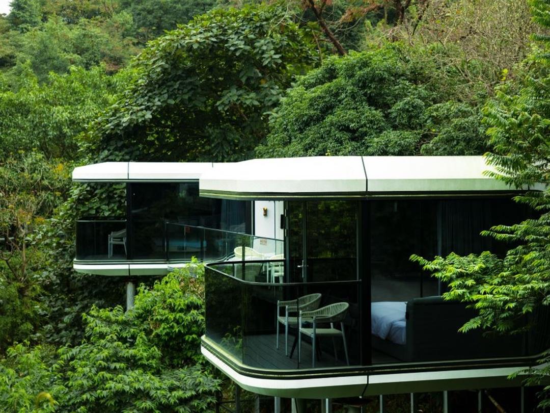 藏身于山谷之间的太空舱,周围树木枝叶繁盛,层叶荡漾,偶见远山。依山而建的太空舱,270°观景视野让你暂离喧嚣城市,感受山居生活之美。