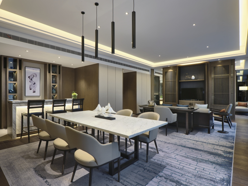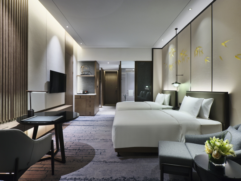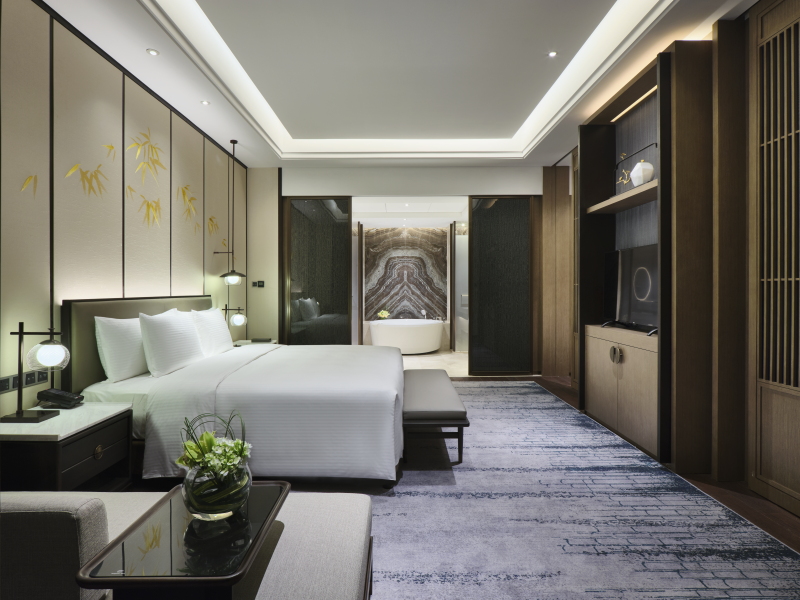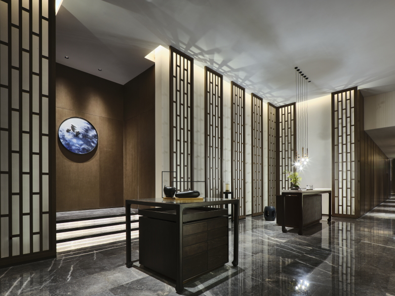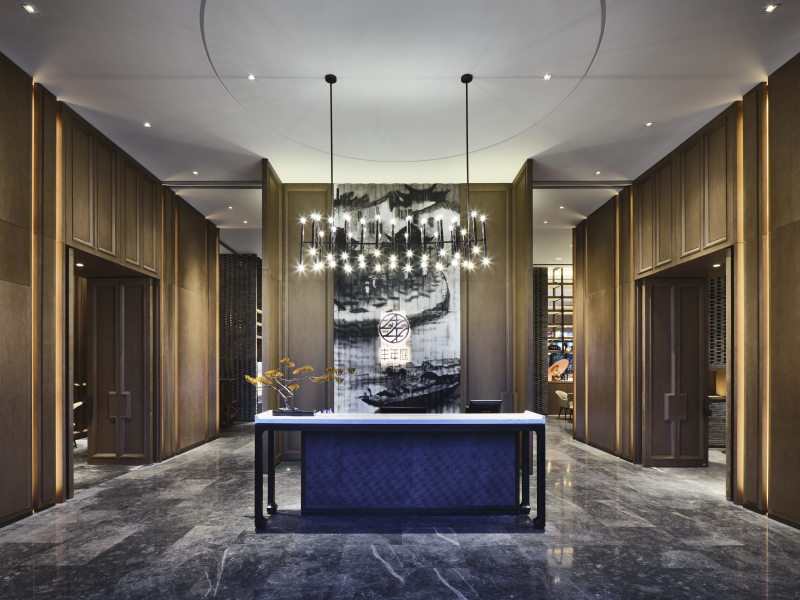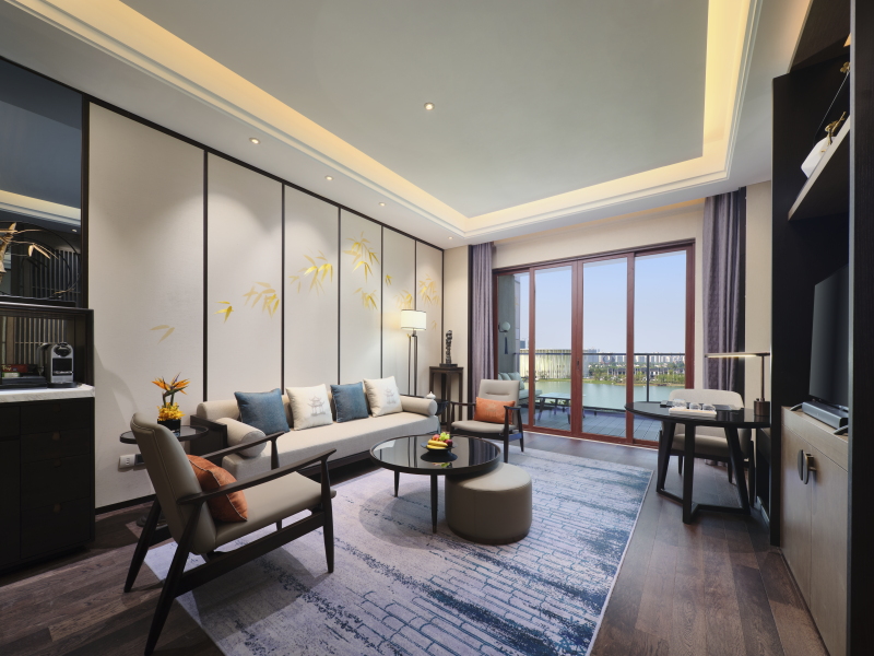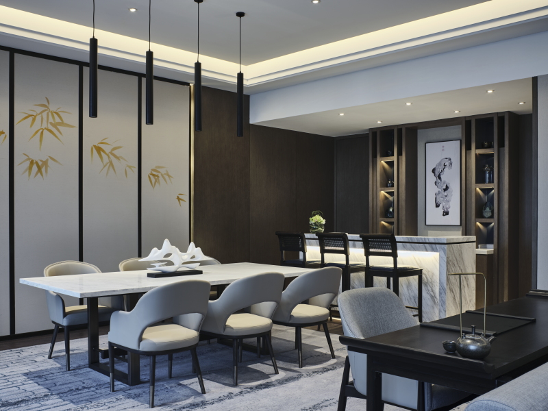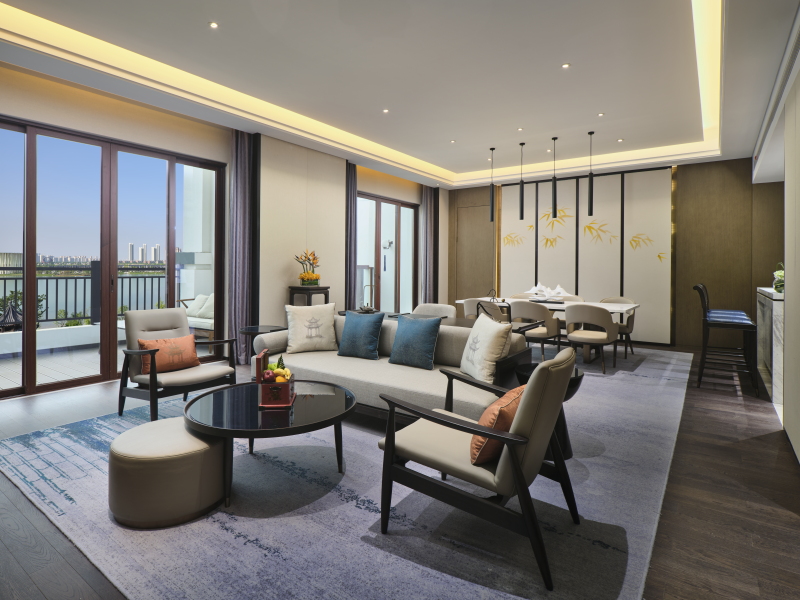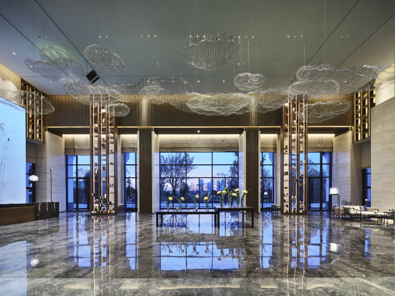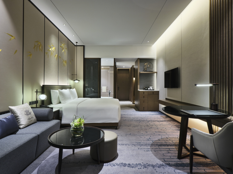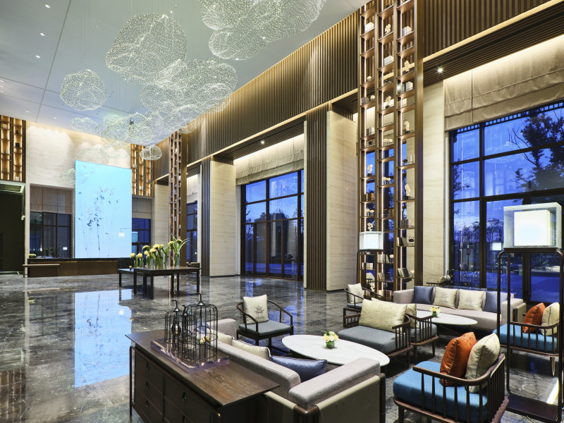 酒店整体建筑风格表现了江南传统建筑亮洁优雅的气质特点,又融入了官式古典建筑结构的富态端庄之美,展现了浓郁的吴地文化风韵,与设计主题贴合,地毯及墙纸都以竹为设计元素,淡雅脱俗。
