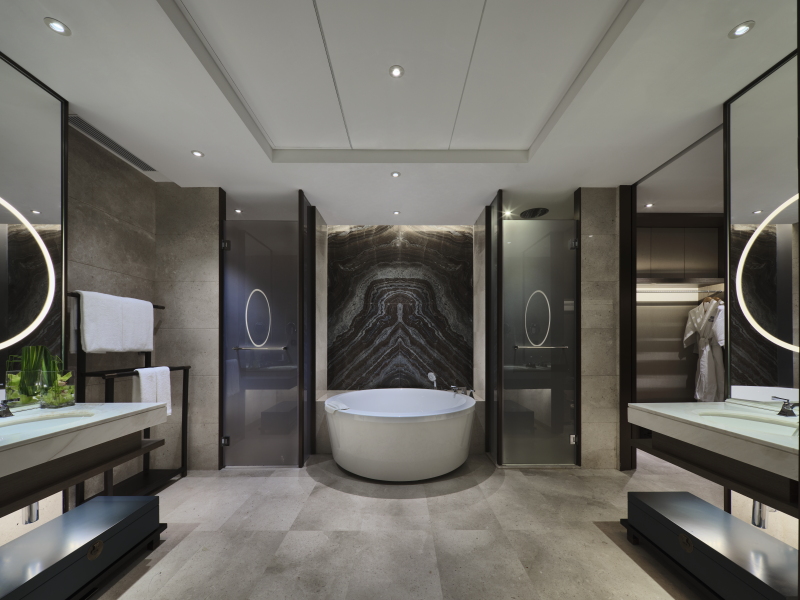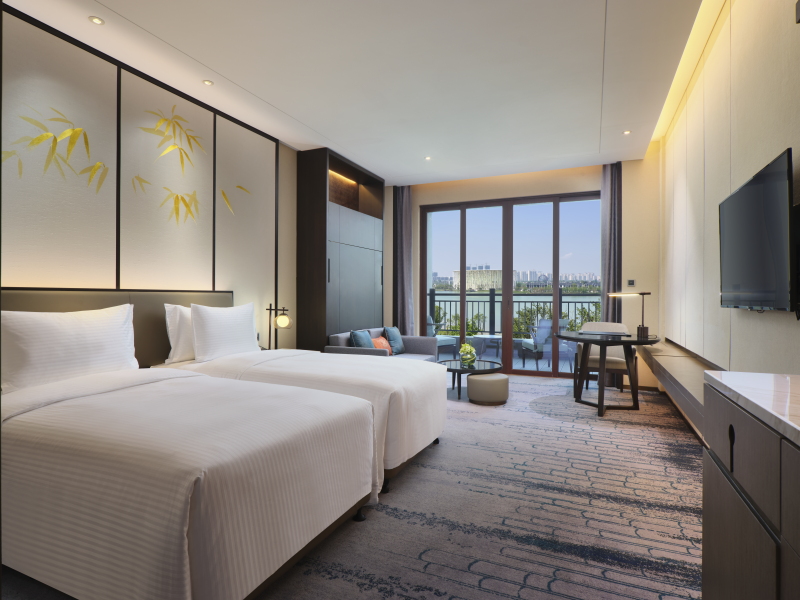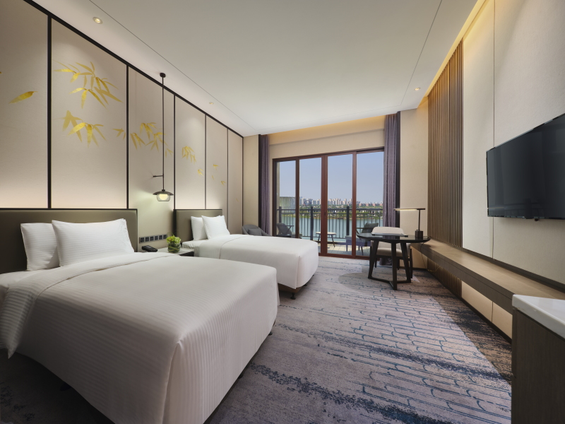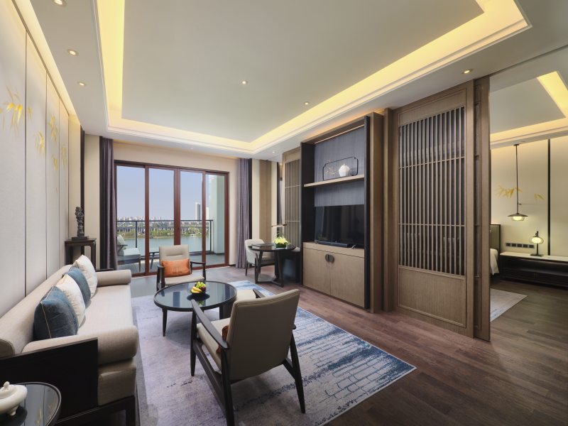 酒店一共有298间客房,3-9F则能将湖景+园景兼得。房内设有180度观景阳台,直面太湖,白日览湖光山色,夜间赏玉壶光转。