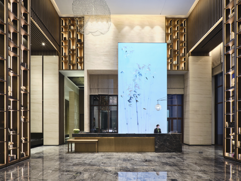 酒店整个设计选用了江南水乡的柔美、书香气息及青林翠竹、白墙黛瓦等特征,在尊重江南民居建筑秩序与对称的美学基础上,提炼“书、水、月、竹”元素,表达出“竹林书海”的设计主题。