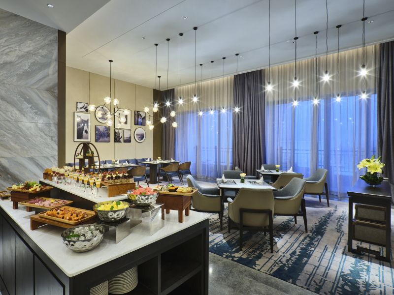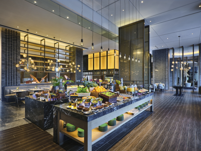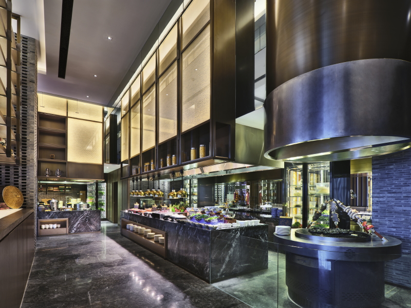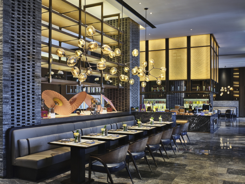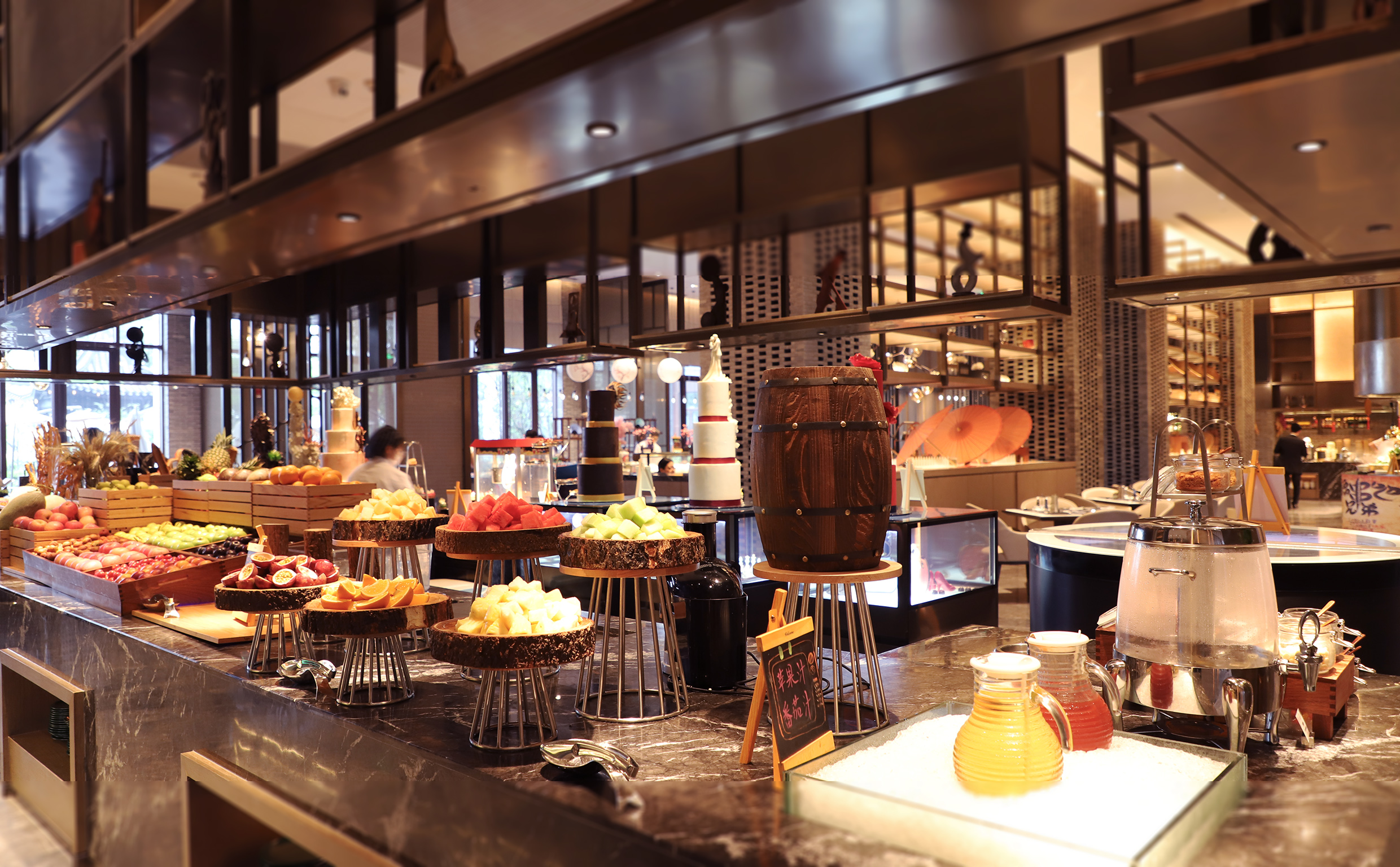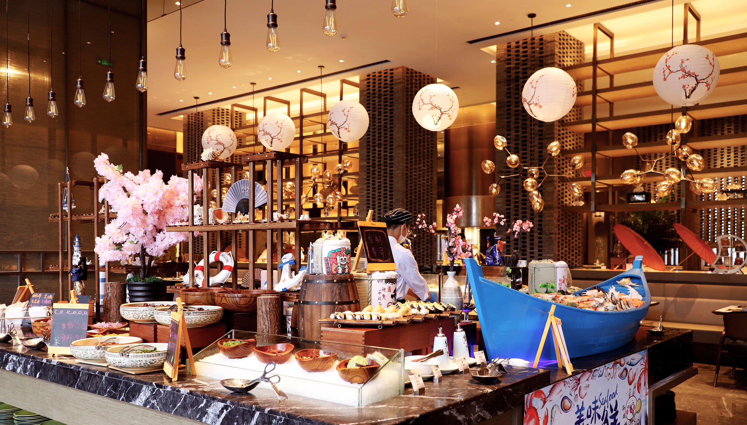无锡融创万达嘉华酒店的丰年庭全日制餐厅与大堂酒廊为邻,以“松树”为界,中式环境氛围设计,加入日式元素,很清新。