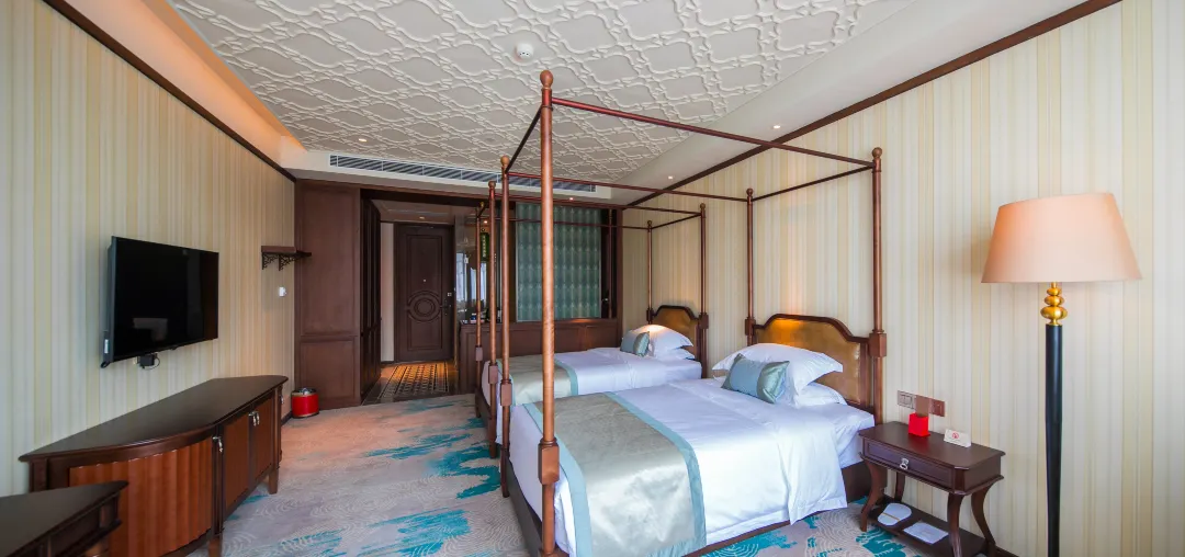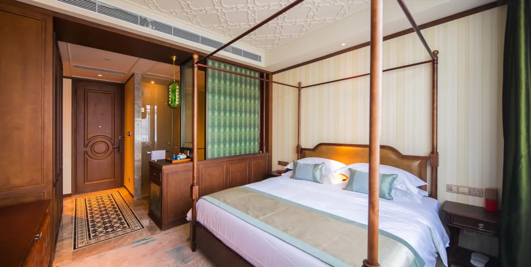 彩色玻璃的灯罩下,昏黄的灯光中,酒店房间处处传递着浪漫温暖的气息,让你一扫旅途的疲乏。