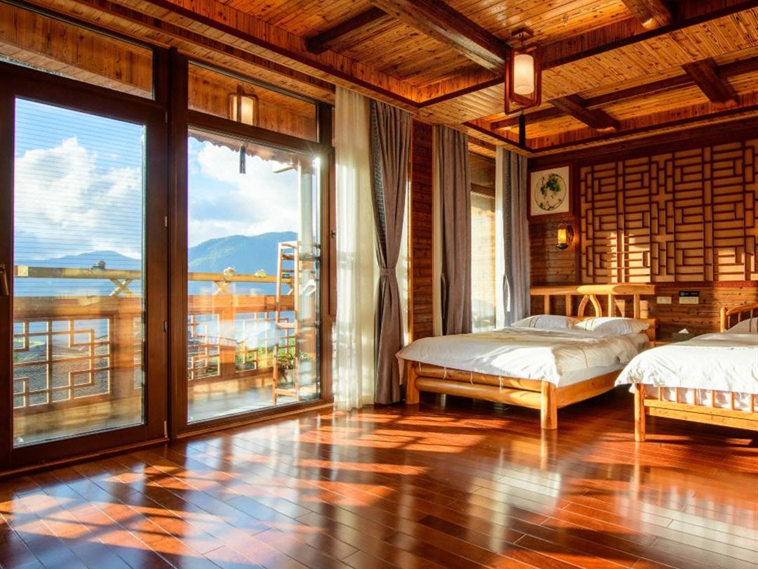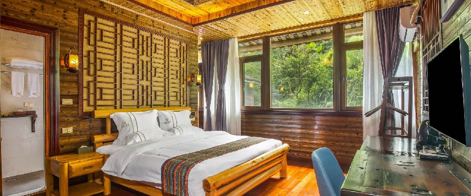 酒店内搭配木质家具、各具特色的陶器以及当地手工制作的木艺雕刻,古朴的颜色和质感,让整个酒店与周边环境相得益彰。客房呈现民族现代设计风格,室内配饰体现了各种少数民族文化元素