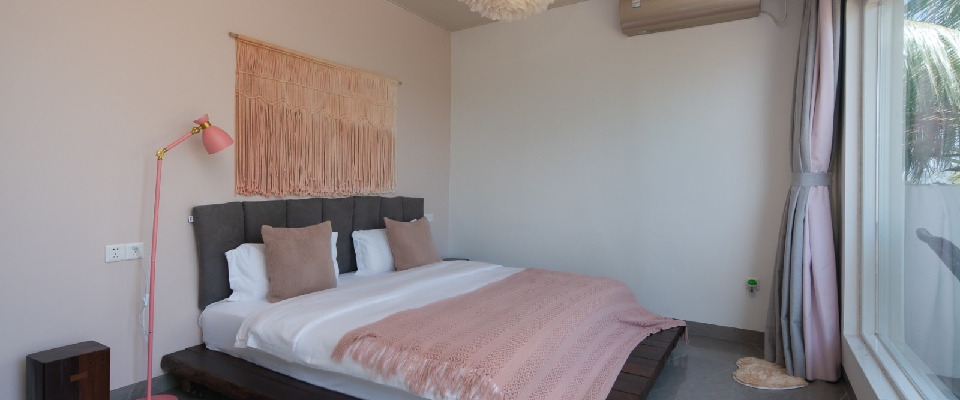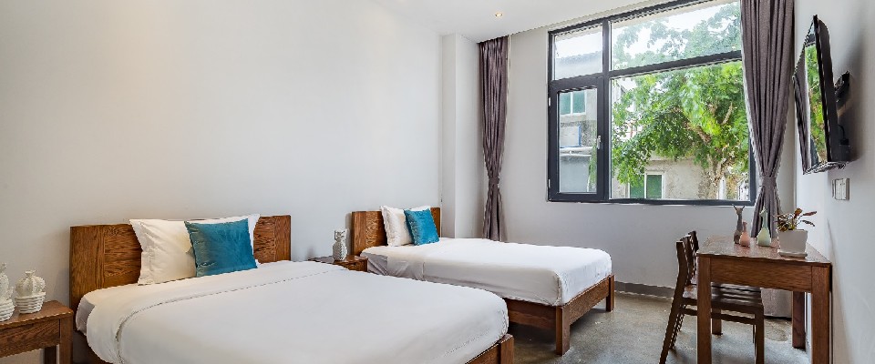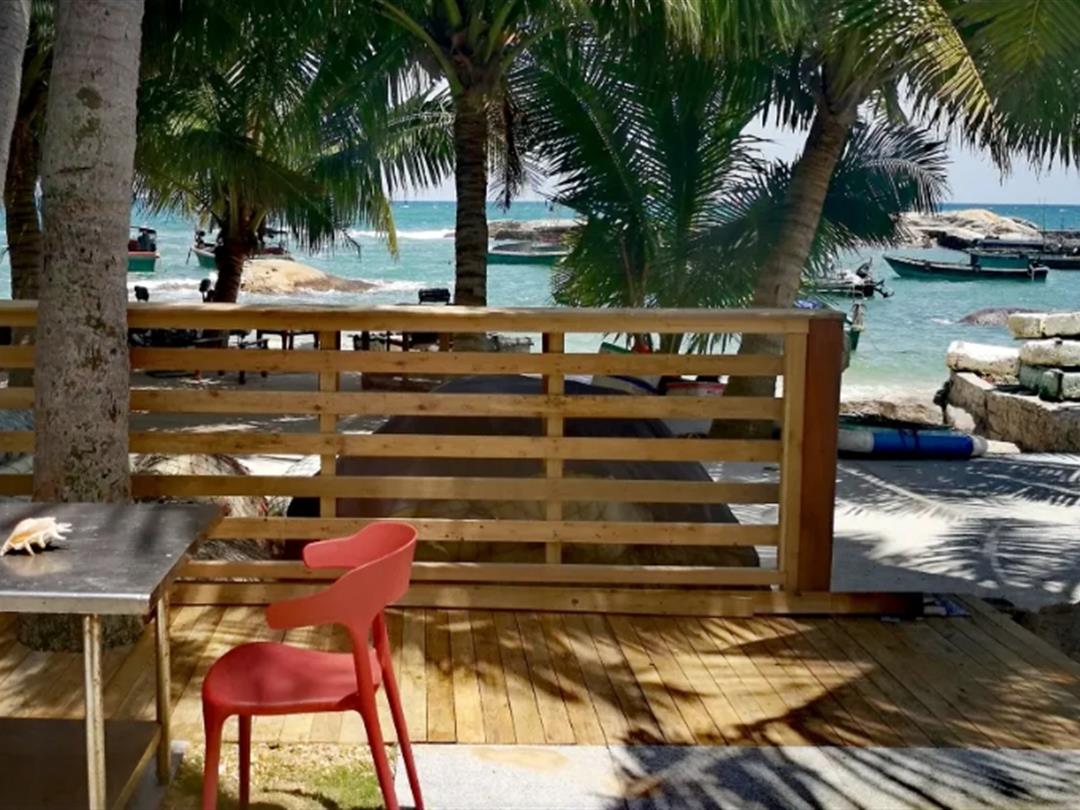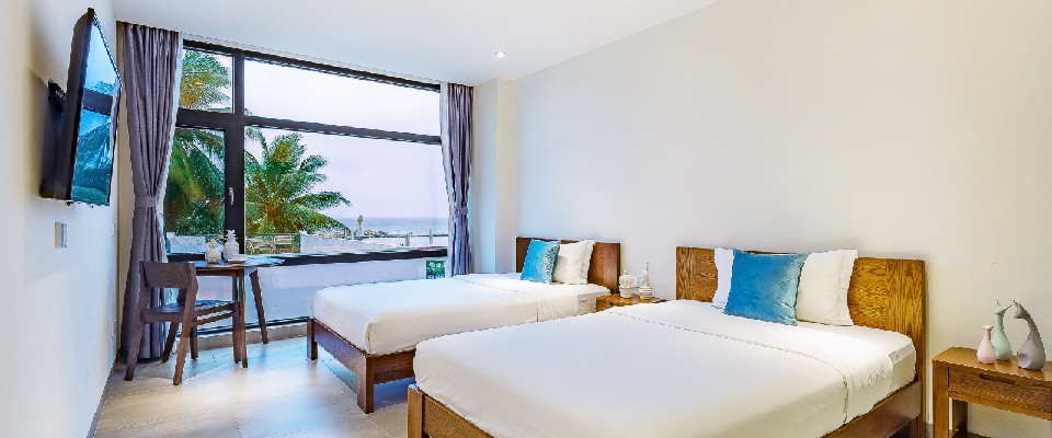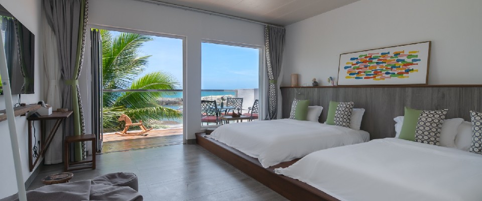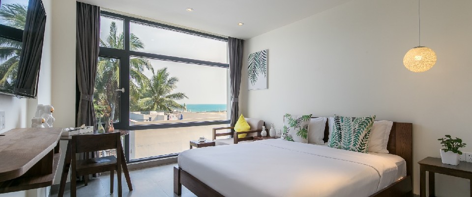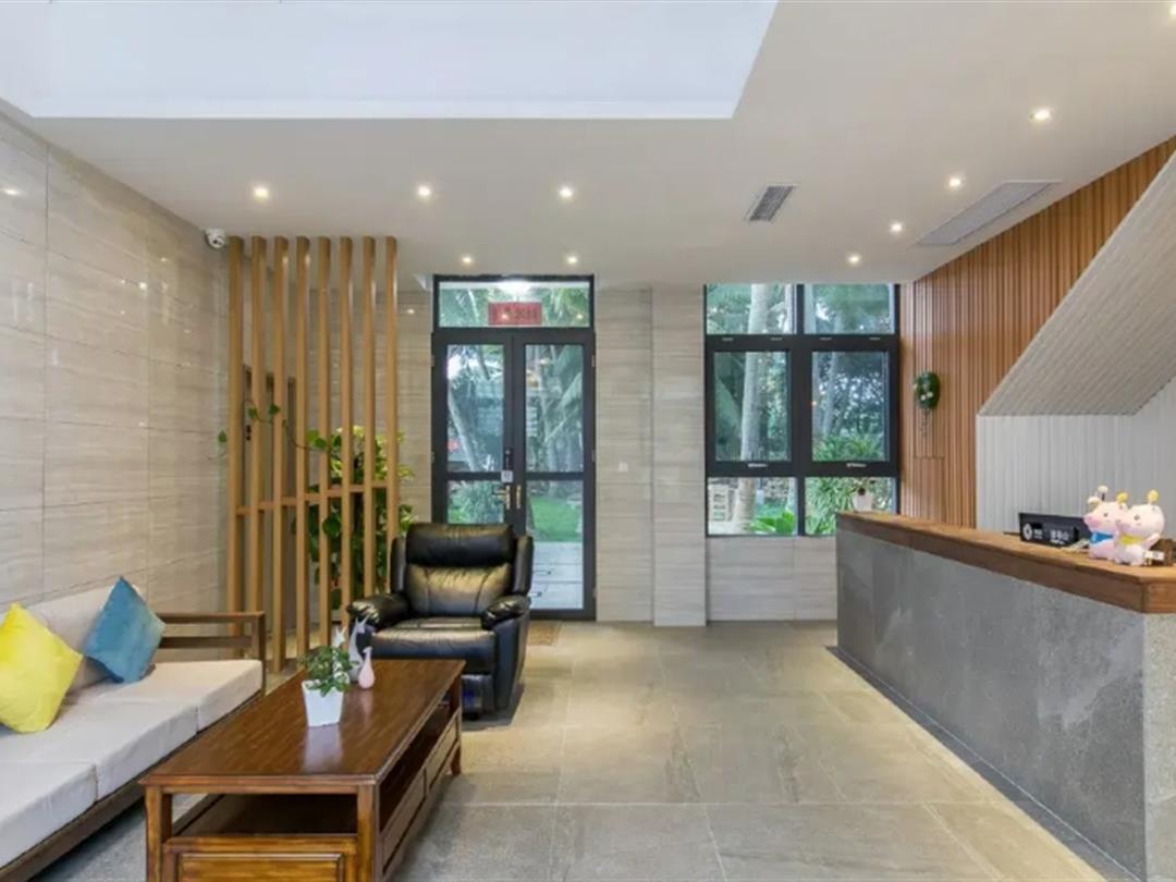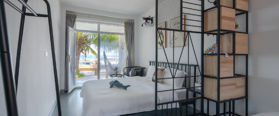 民宿由三层主楼、独立厨房(餐厅)、临海前院和椰林后院组成,外观极富设计感,灰白基调装饰简约大方,实木家具,大面积中空断桥铝隔热玻璃门窗让海景一览无余