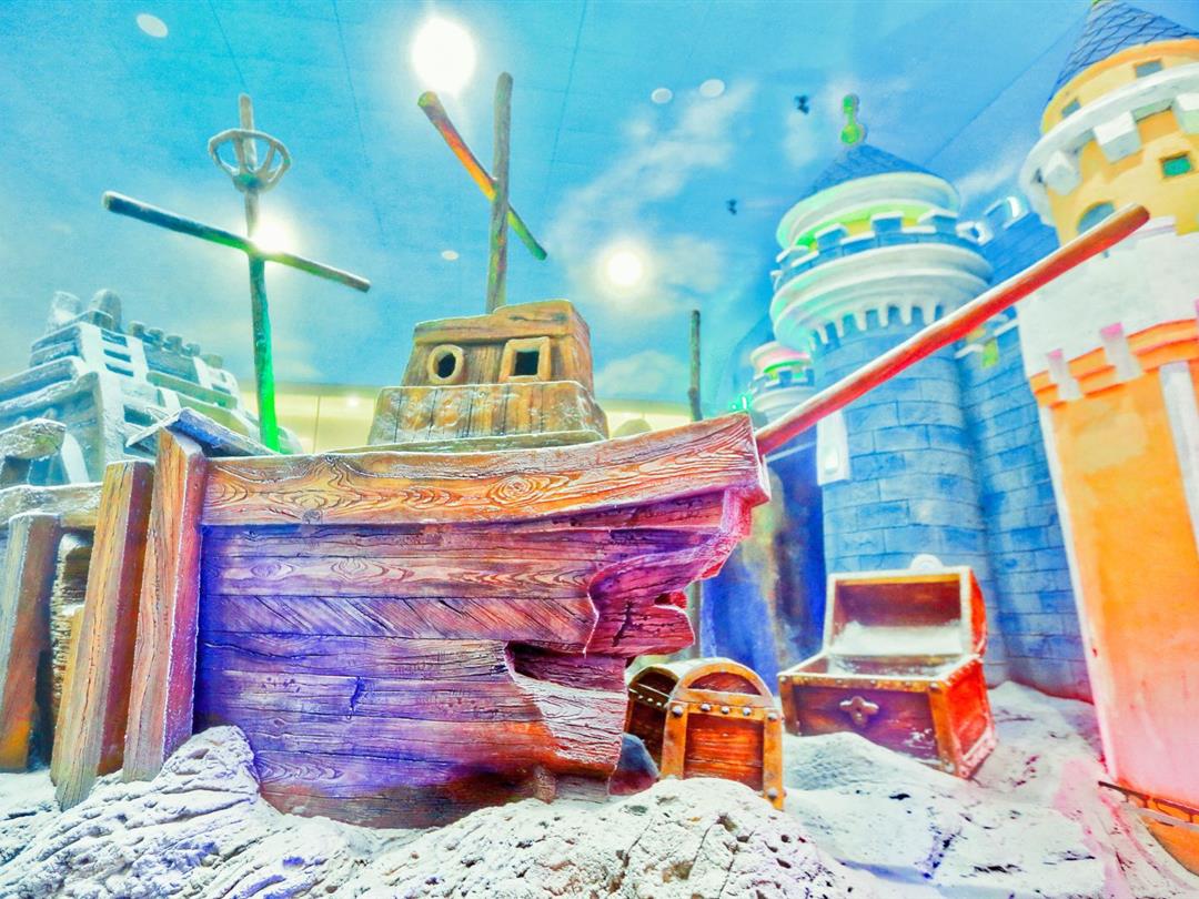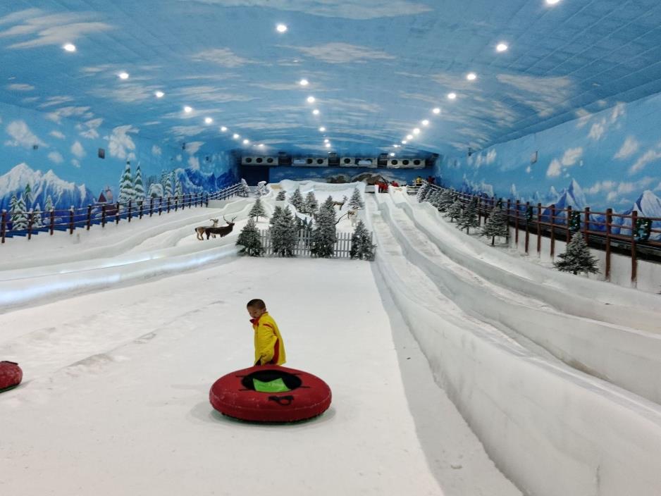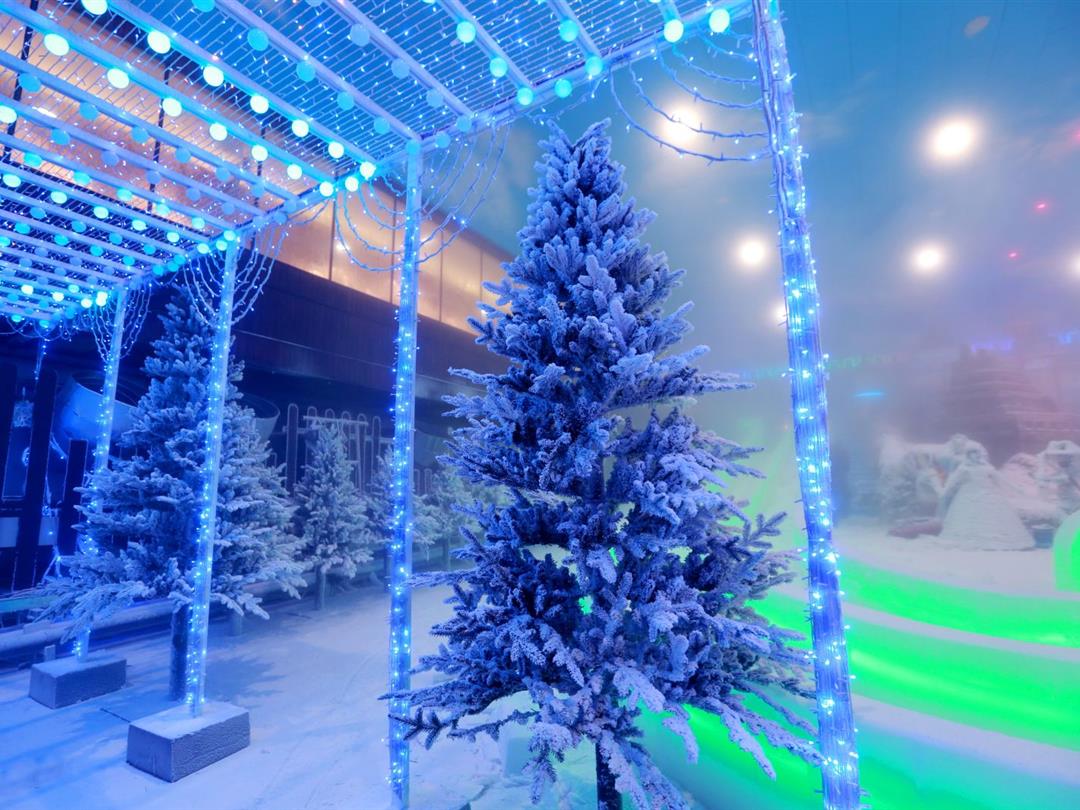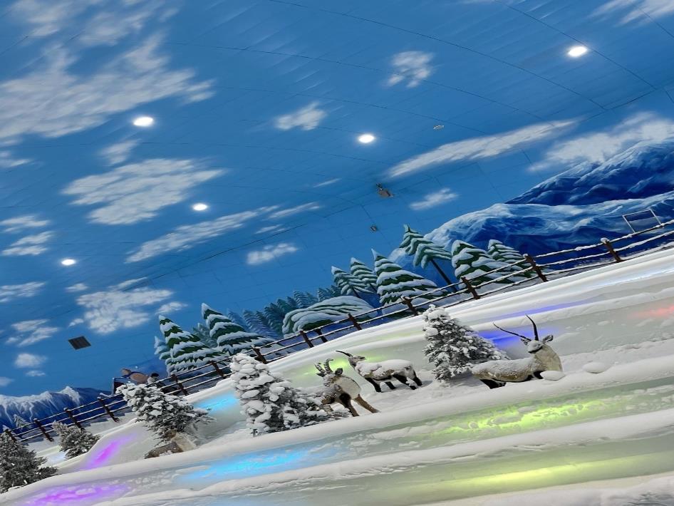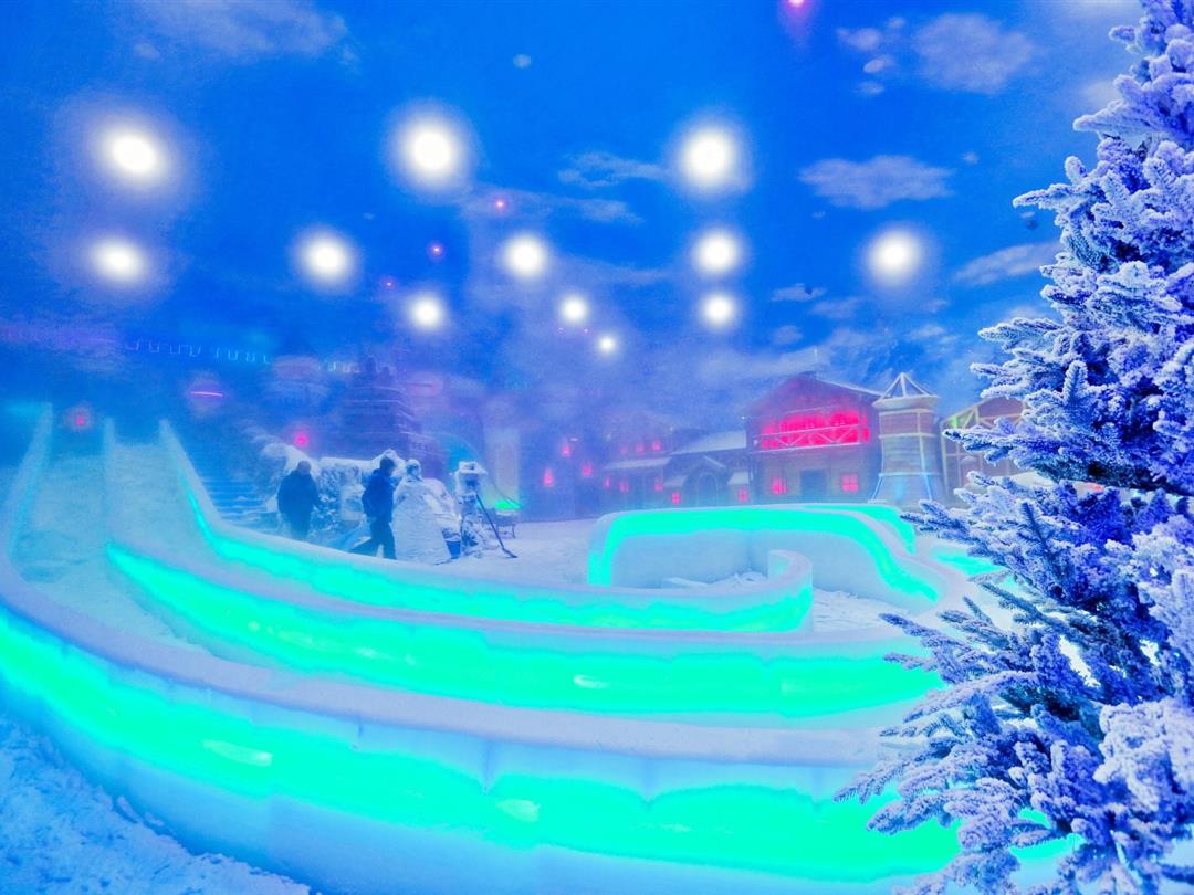 冰雪世界主要分三大部分,冰雕区、溜冰区、滑雪区。冰雕区五彩斑斓,一座座透明冰雕在景观灯的照耀下绚丽夺目;溜冰场犹如天然的冰湖,游客可尽情开展冰上舞蹈、花样滑冰等运动;在滑雪区可尽情速度与激情的乐趣。