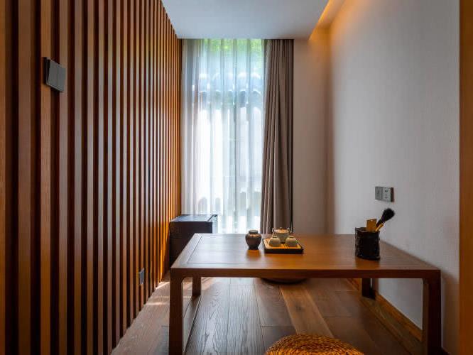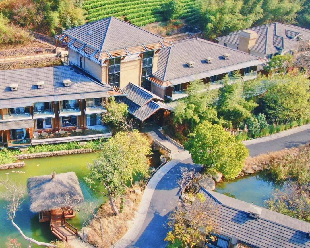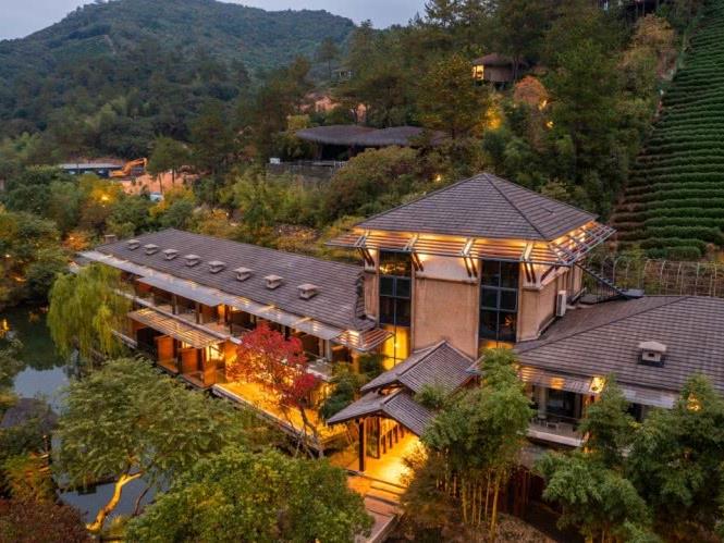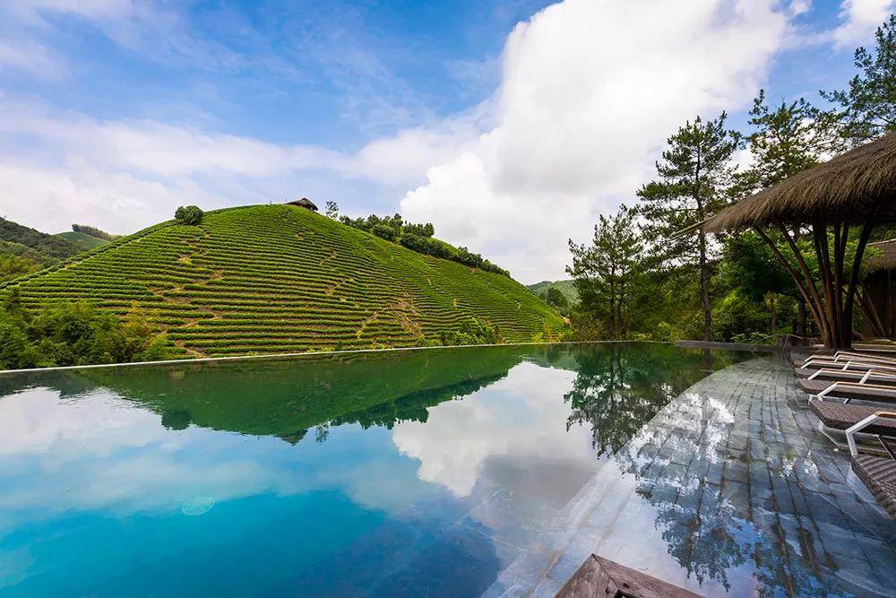 酒店三面环山,独拥十亩水域,竹林与茶田截然,溪流与湖泊相遇,全域面积约800亩,是一处得天独厚的避世之所。