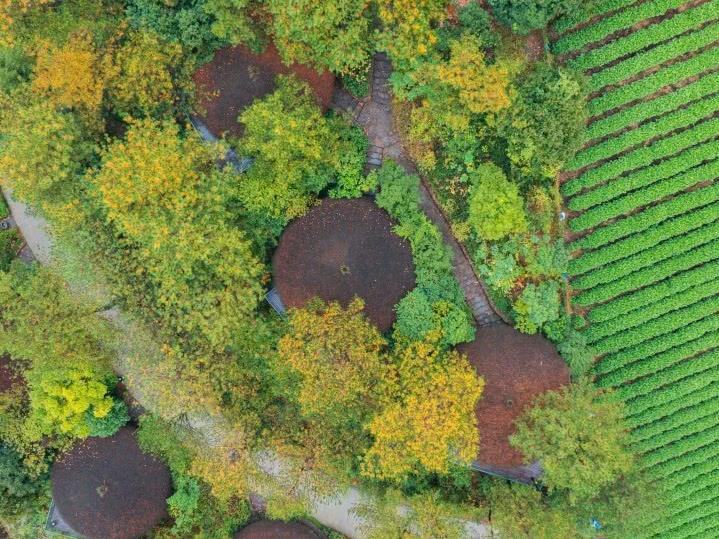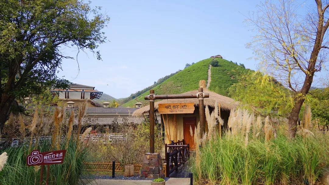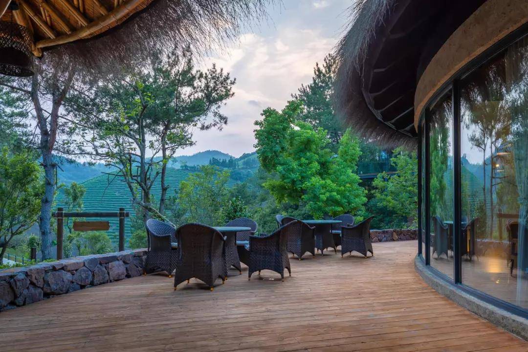 圆形的设计仿佛古代隐于山林间的茅草屋,这里绿植环绕,与茶田相对,若是古人能来这里住上一宿那唐诗想必可不止三百首了~