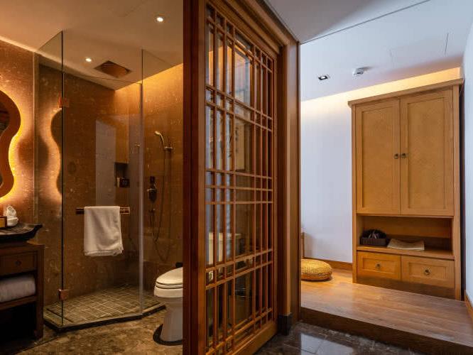走进客房又是满满的木质元素,再与这眼前的绿意相接,就像住进了森林中的参天大树,或是童话木屋之中。
