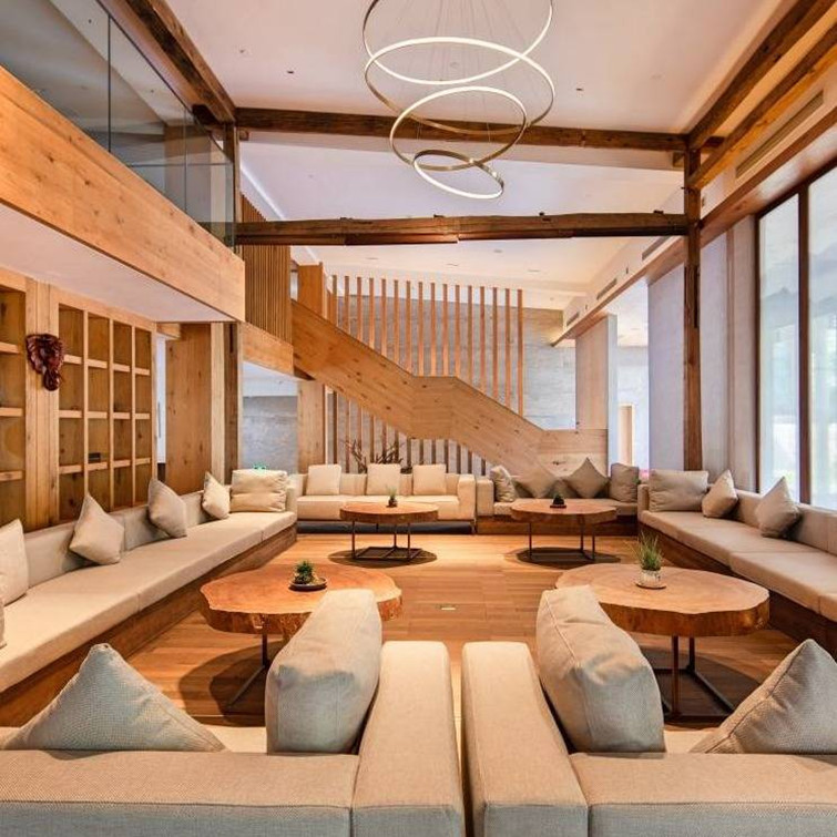 走过前台与长廊,抵达大堂,这里被设计成了舒服好看的“客厅”,迎面而来的便是通透的玻璃门窗,可将室外四季全然展示,右手边则是高挑的休憩区。