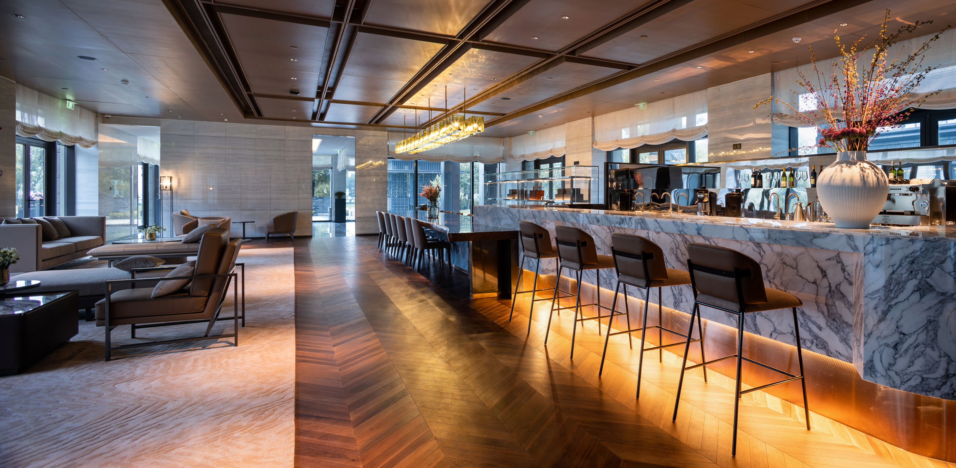 大堂吧现代风格,高级大气又不失情调。吃完饭或者在酒店空闲的时间可以来喝一杯咖啡(当然还有其他饮品)。