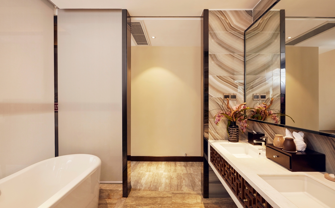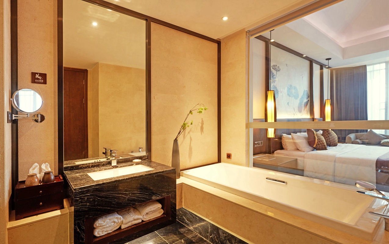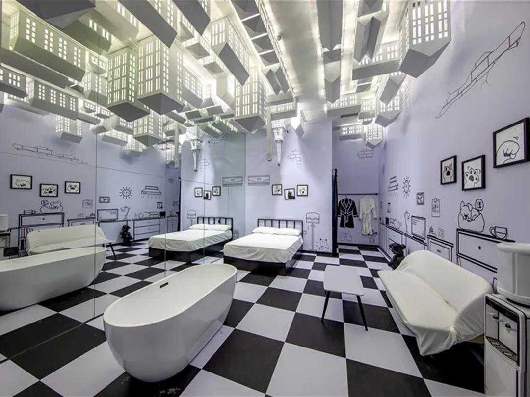 银白色与原木相交织,天花板被镜像铺满,亦梦亦真,让彼此遗忘世界,只尽情演绎比翼缠绵。