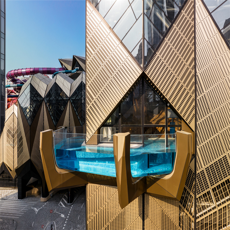 除了室内畅泳空间,天际星空池亦延伸一部份至室外,犹如悬浮畅泳半空,抬头可欣赏天空万象,透过池底透明玻璃则可俯瞰别样风景