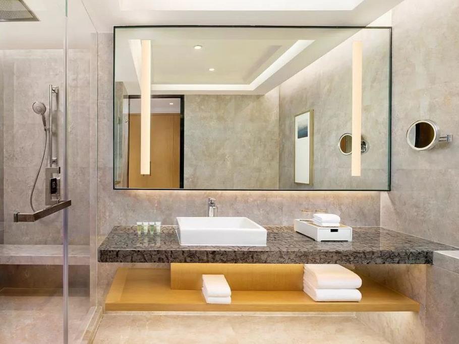 空间设计布局很赞,配置齐全:大大的落地窗前设有沙发或卧榻;百年品牌床垫和亲肤纯棉床品让客人整晚安心睡眠;50英寸液晶电视、大理石卫浴、科勒洁具以及长长的洗漱台可以把洗漱用具一应摆开。