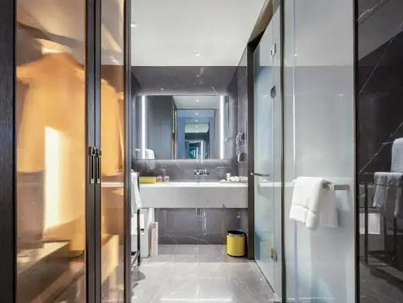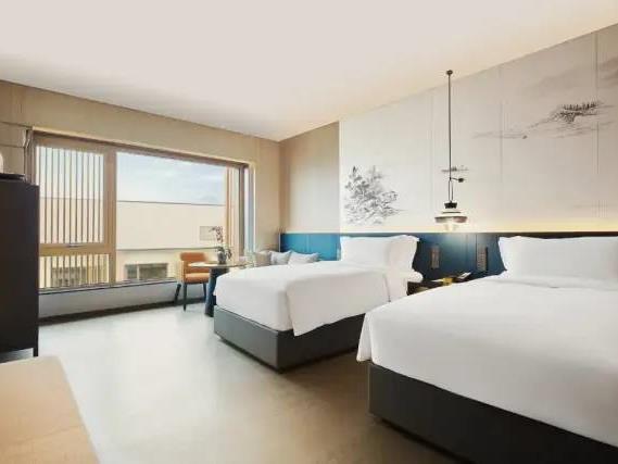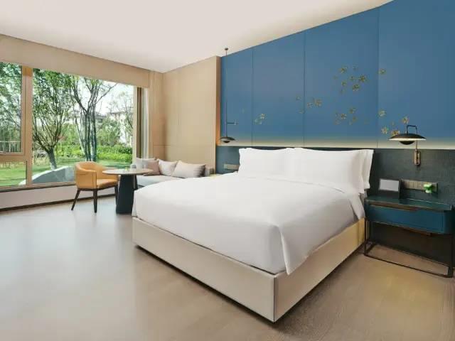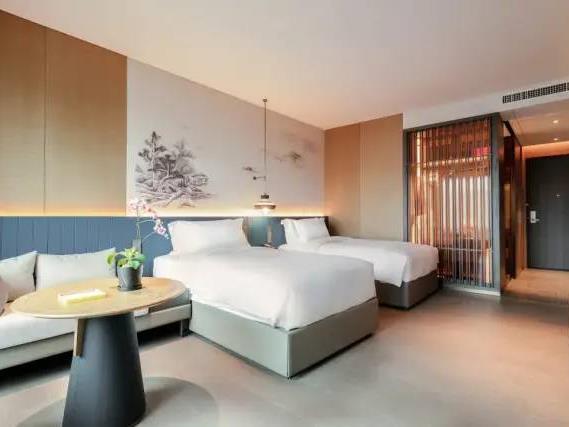 203间美荟客房和套房,基础面积42㎡,全景落地窗的设计,让空间更开阔明朗,大部分客房还设有步入式阳台,能直接走到户外感知四季。背景墙面融入云锦戏曲、写意山水、梅花等古典元素,巧妙运用色彩与光影,虚实相生与“剪影如画”的理念,带来诗意居停体验。