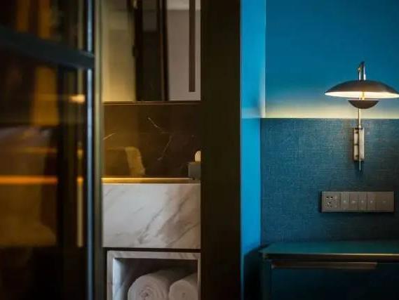 房间配置智能家居控制系统及胶囊咖啡机,细节处蕴含巧思,比如:独立床屏联通睡眠、起居区,衣柜称为“光影之盒”,采用夹丝玻璃和金属材质与灯光结合,为空间增添科技感与趣味性,且延伸卫浴区的空间视觉。