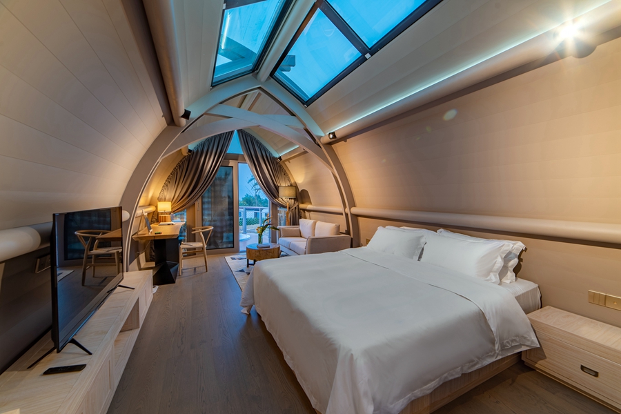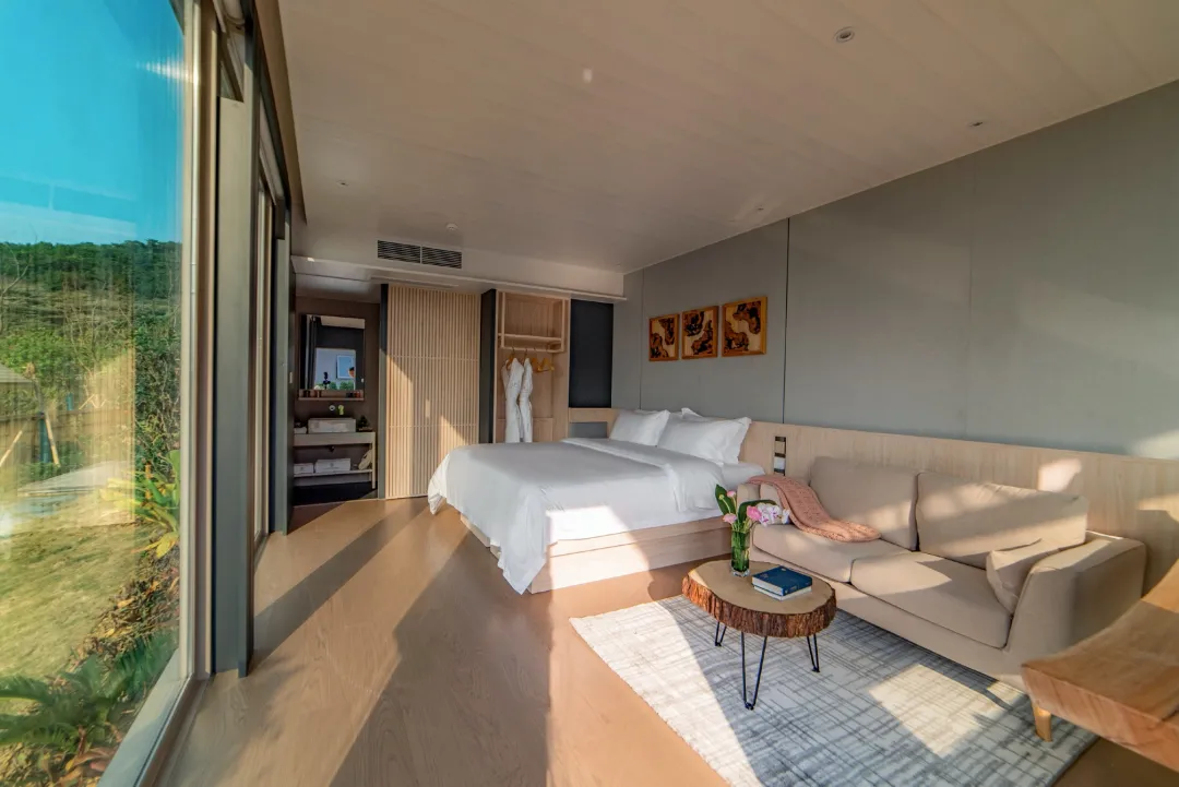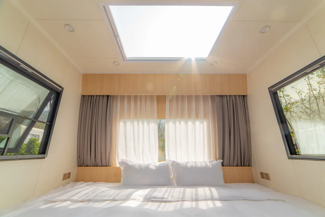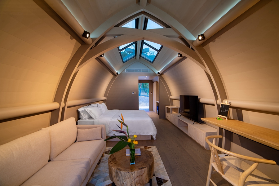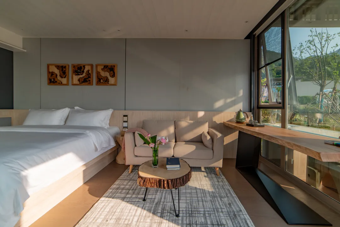 度假村设有5种不同房型,共48间高级客房:天喜(房车)、海后(船屋)、比邻(复式)、大角(合院)等特色房型,每个房间设有“星空之门”,让住客近距离感受星空之美。