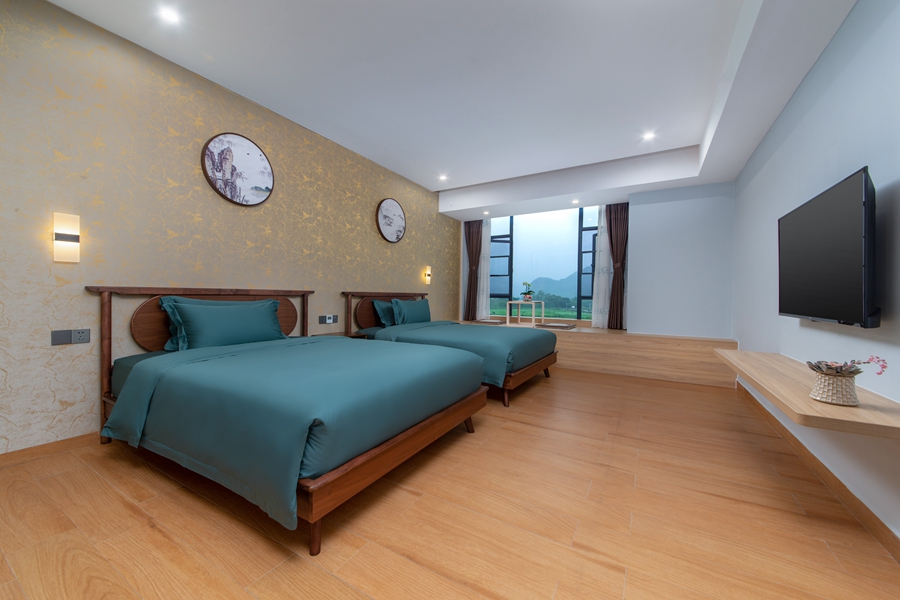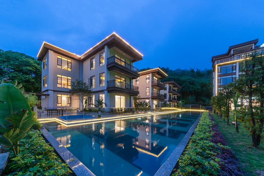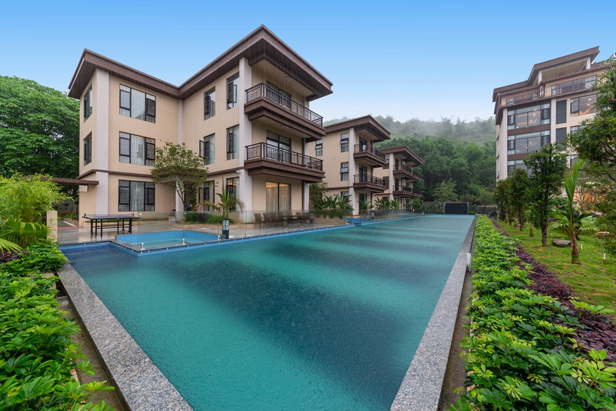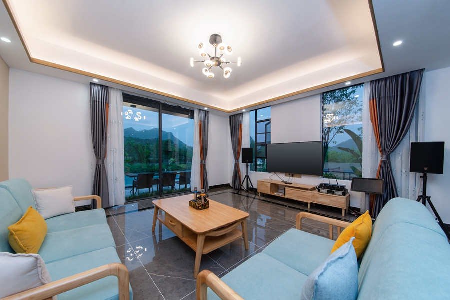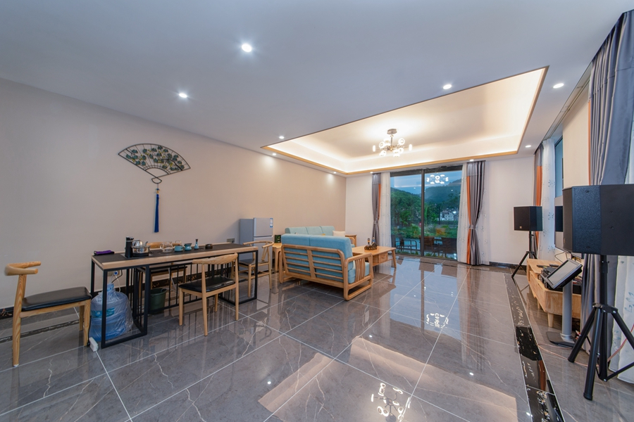 每栋别墅分3层,共有5房,房型分别有:3双2大,4双1大,大床为2米,双床为1.5米。每间房设有独立洗手间和淋浴间(配套:私家汤泉泡池,全天供应,麻将桌,KTV,冰箱。