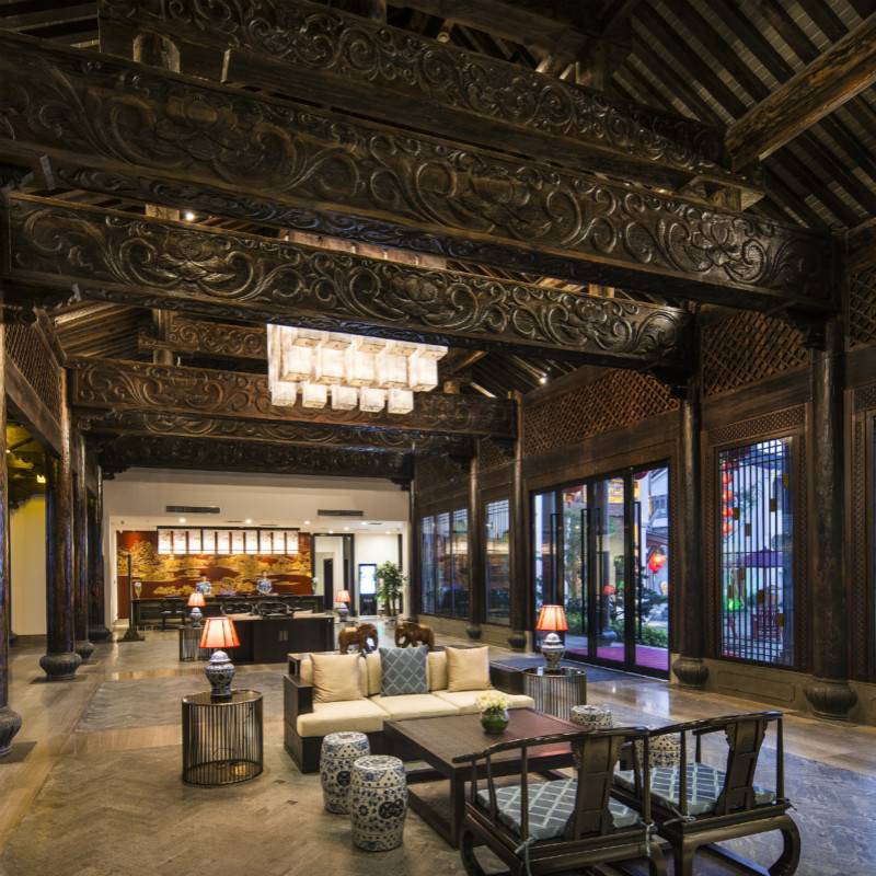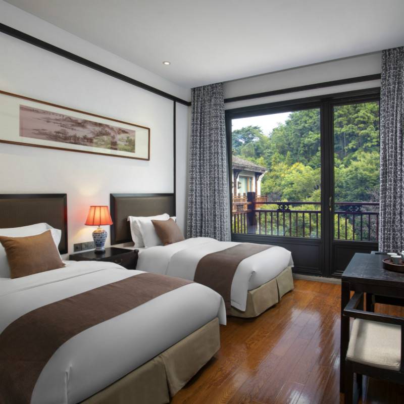 客栈拥有各类竹景客房与套房,客房内的陈设布置取材天然,竹木、绢丝、桑麻等,简约却不简单,巧妙地烘托出了客房的清新雅致。