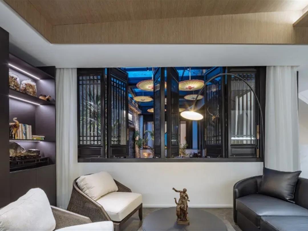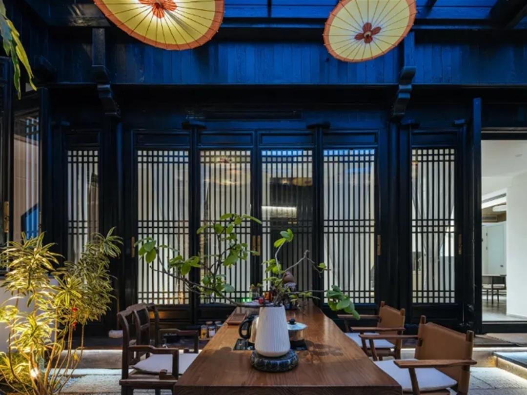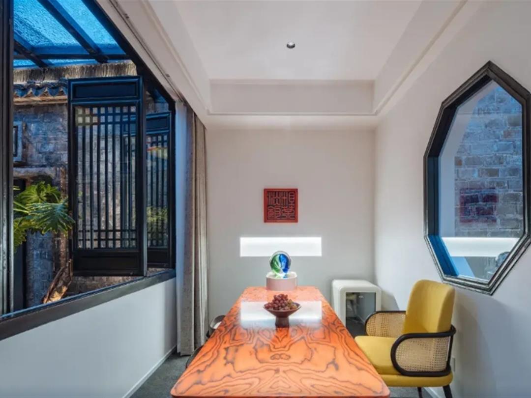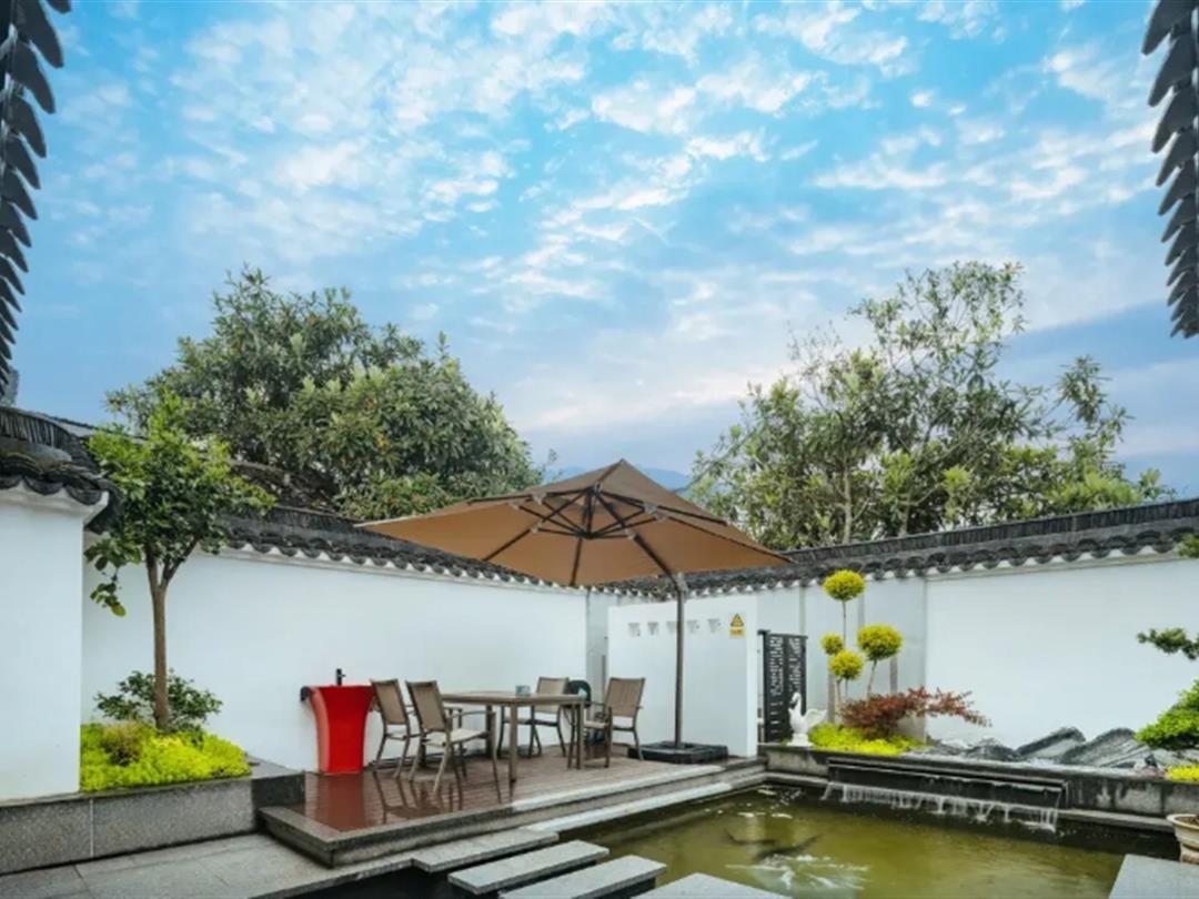 民宿配套设施完善,涵盖生活与娱乐需求。公共区域设有茶室、金鱼池、阅读区及棋牌室,其中茶室落地窗前晨光柔和,庭院石板小径与临河雕花窗是拍照打卡热门地;