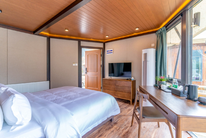 洁白的床单,简单的床梁,创造另一番不一样的精致!,黄色调与木质调相得益彰,好似心都完全静下来了,住进来,你还会发现,里面的配置都是星级配置!